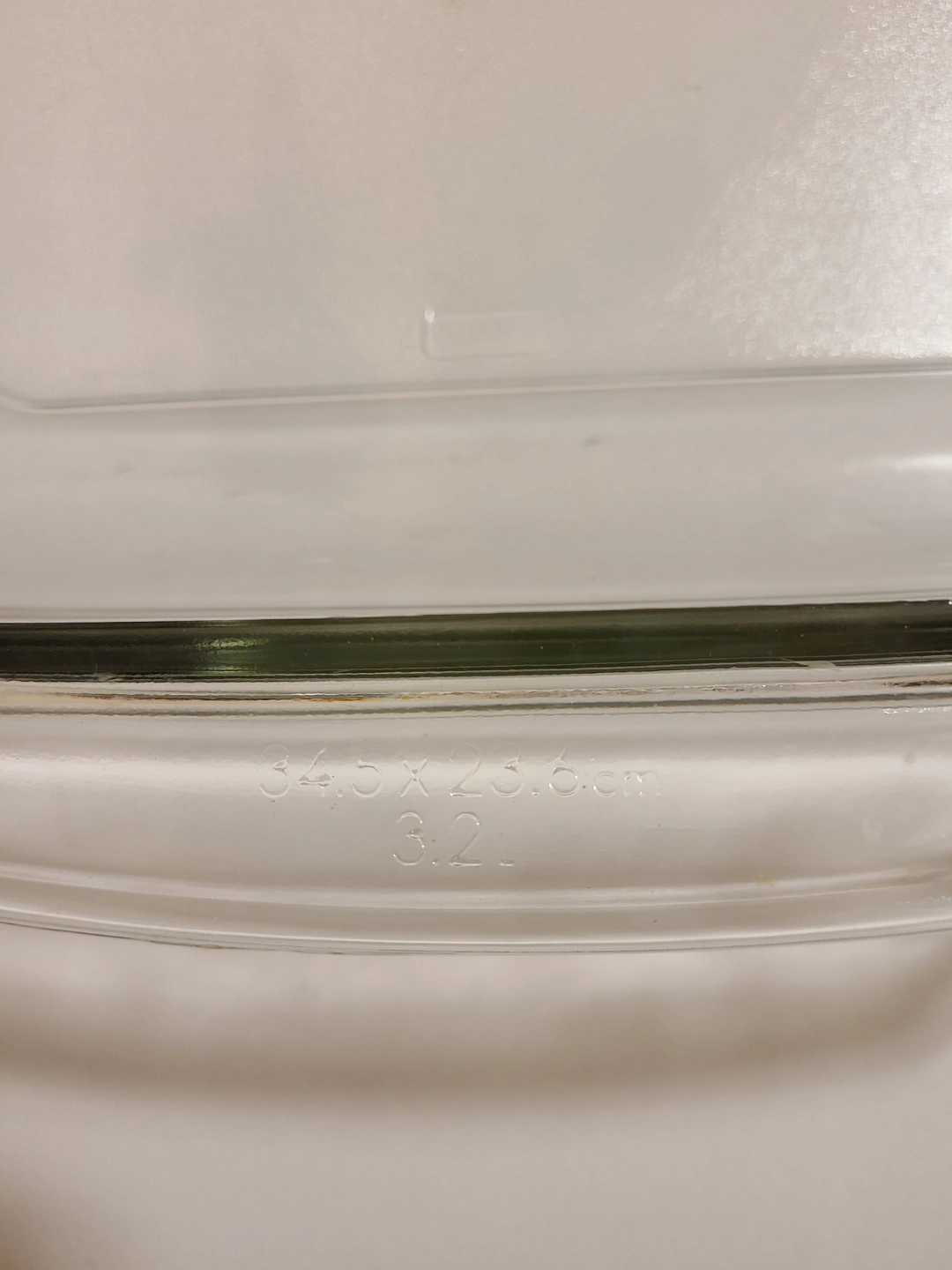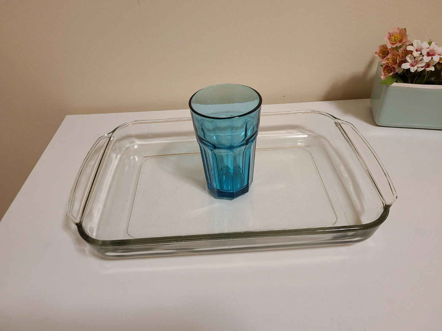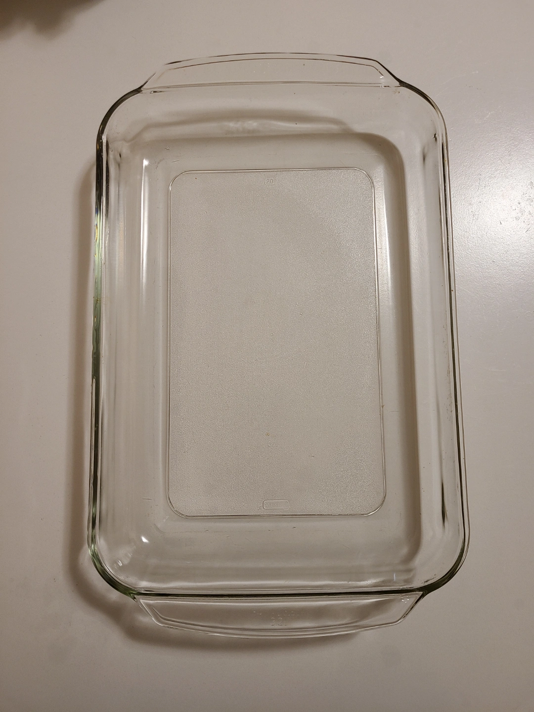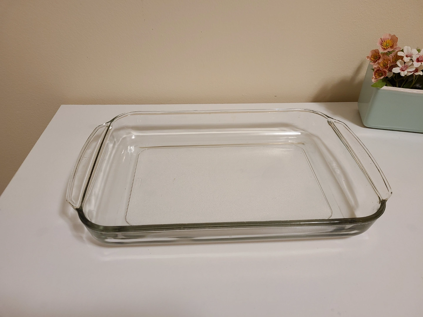 #freecycle Big clear glass baking dish with two handles. Oven-safe. Ideal for casseroles, lasagnas, or other baked dishes. Measures 34.5 x 25.5 cm. Drinking glass for size reference. Feel free to look at my other listings :) Pick up at Keele and Sheppard