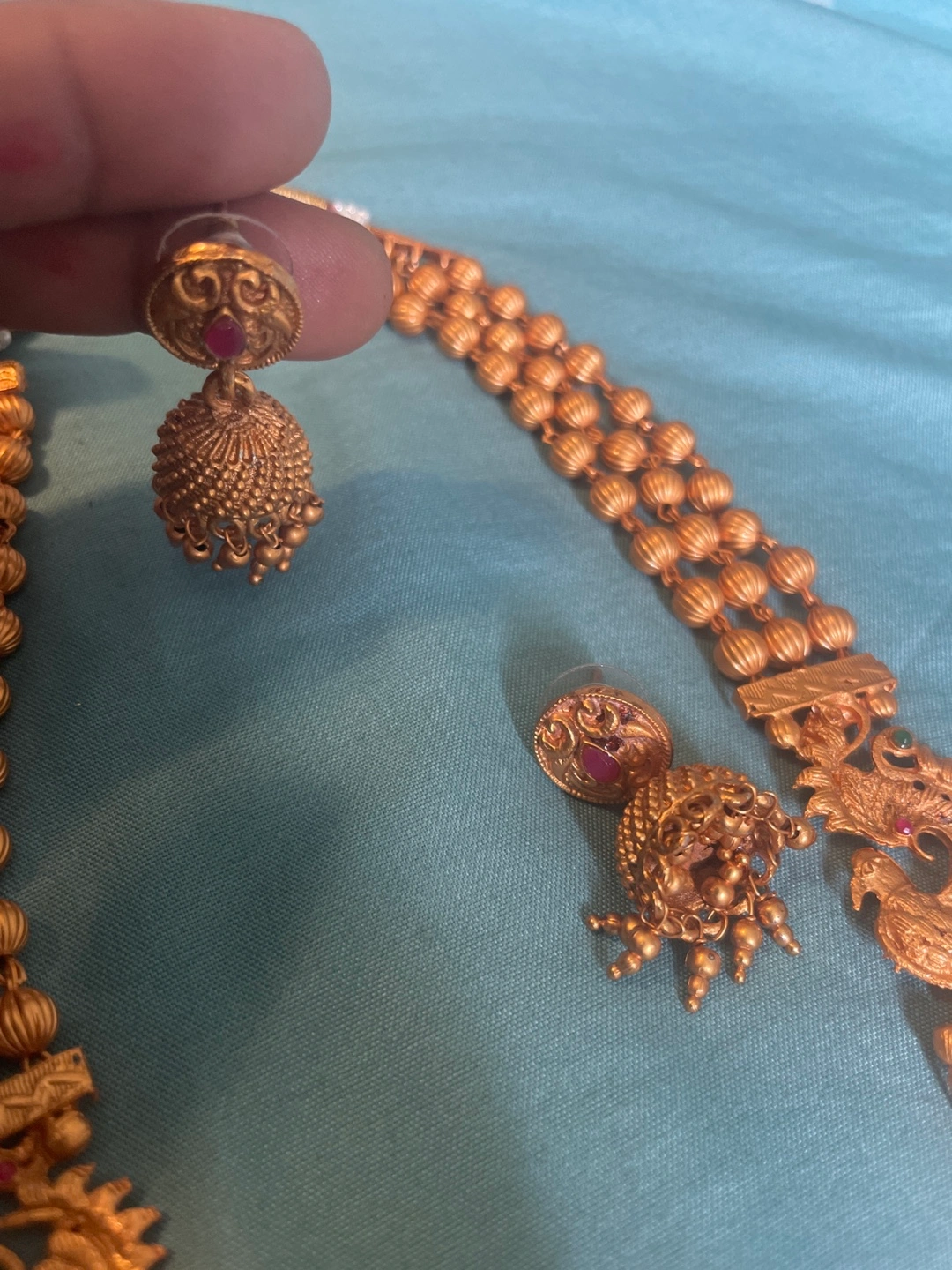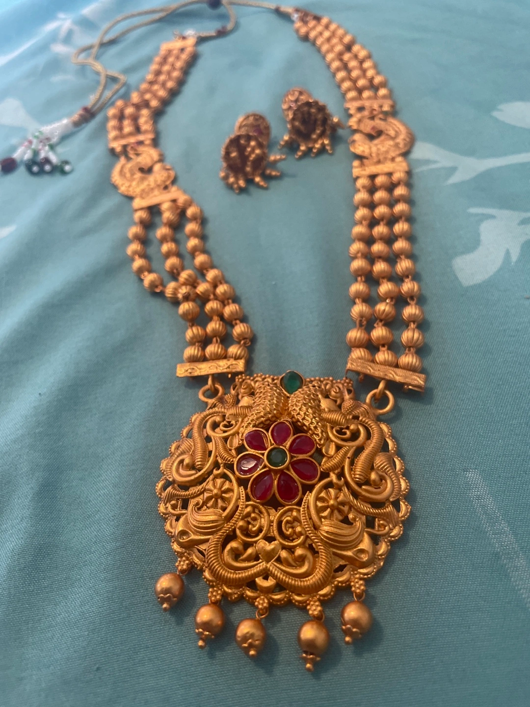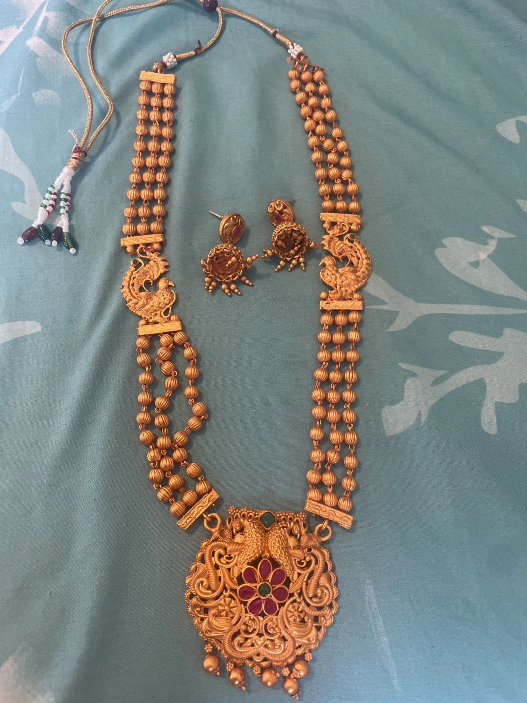 111Gorgeous gold-toned necklace set. Features three strands of beaded chains, peacock-shaped pendants, and matching earrings. Intricate detailing. Red and green stones.