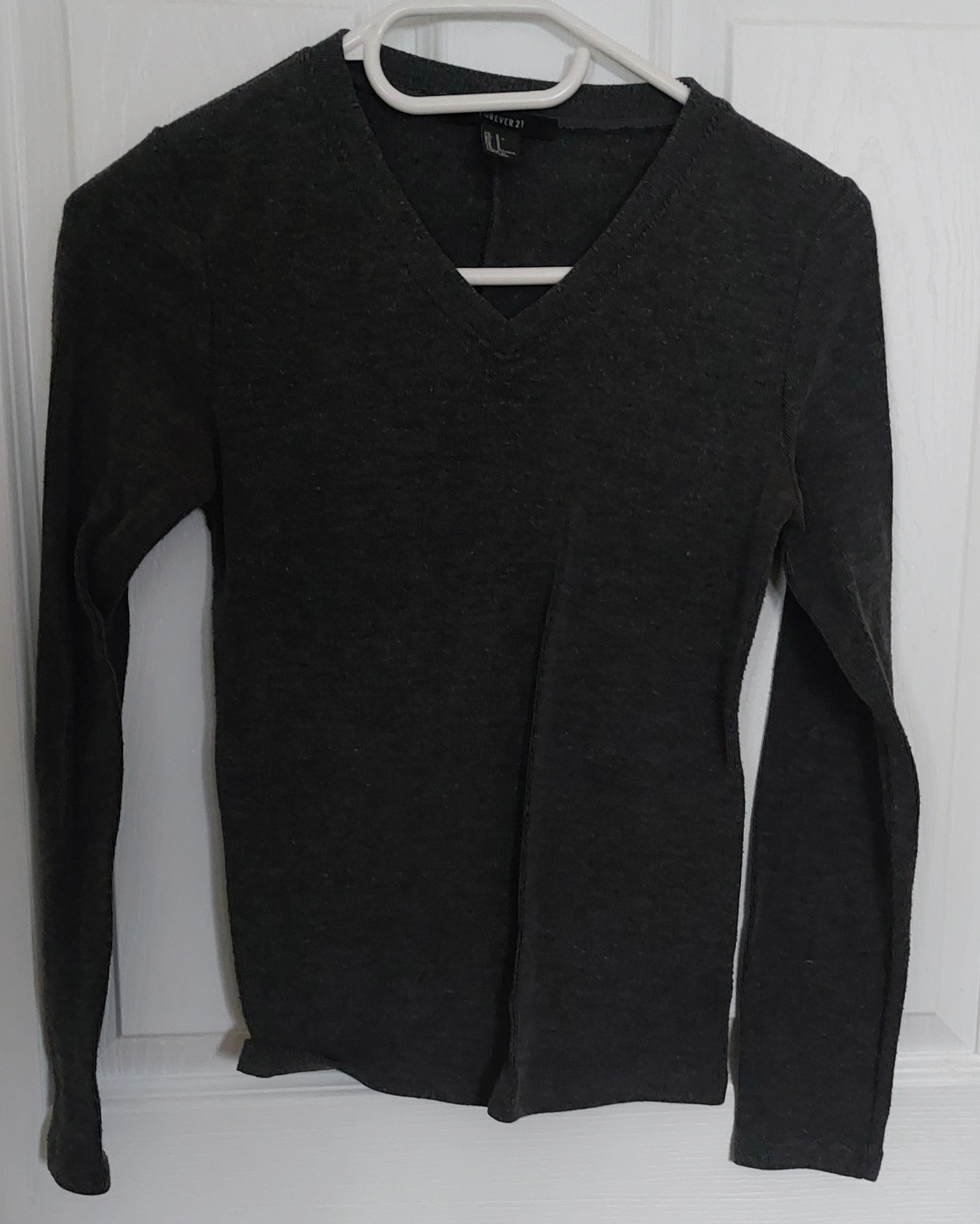 Dark grey long sleeve shirt. V-neck. Soft material. Great for layering or wearing alone. Very warm