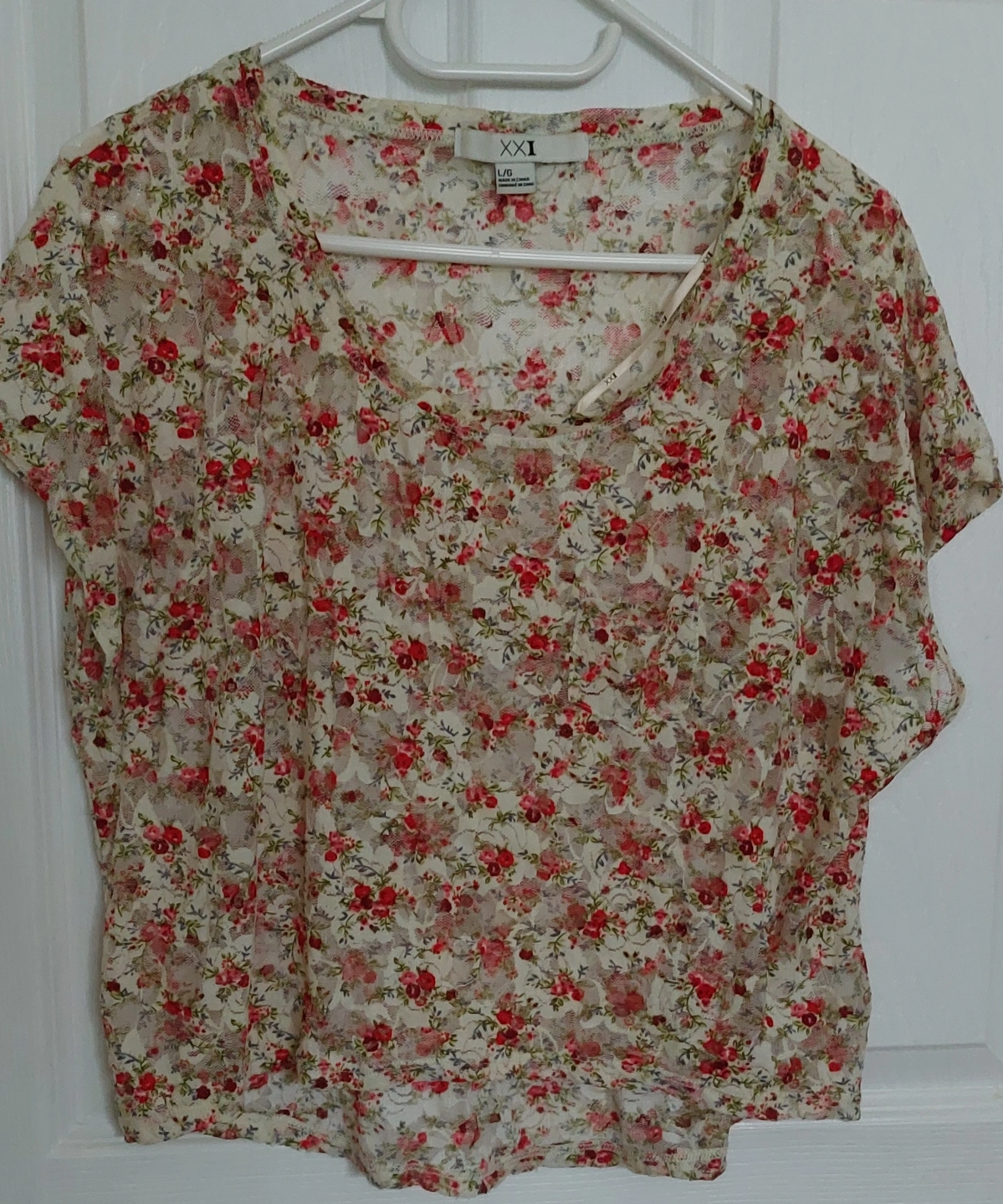 Floral print top. Short sleeves. Cream coloured base with red and pink flowers. Lace detailing. Size L/G.