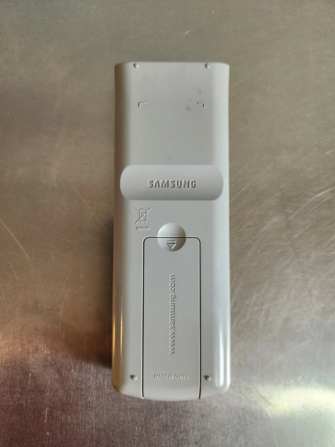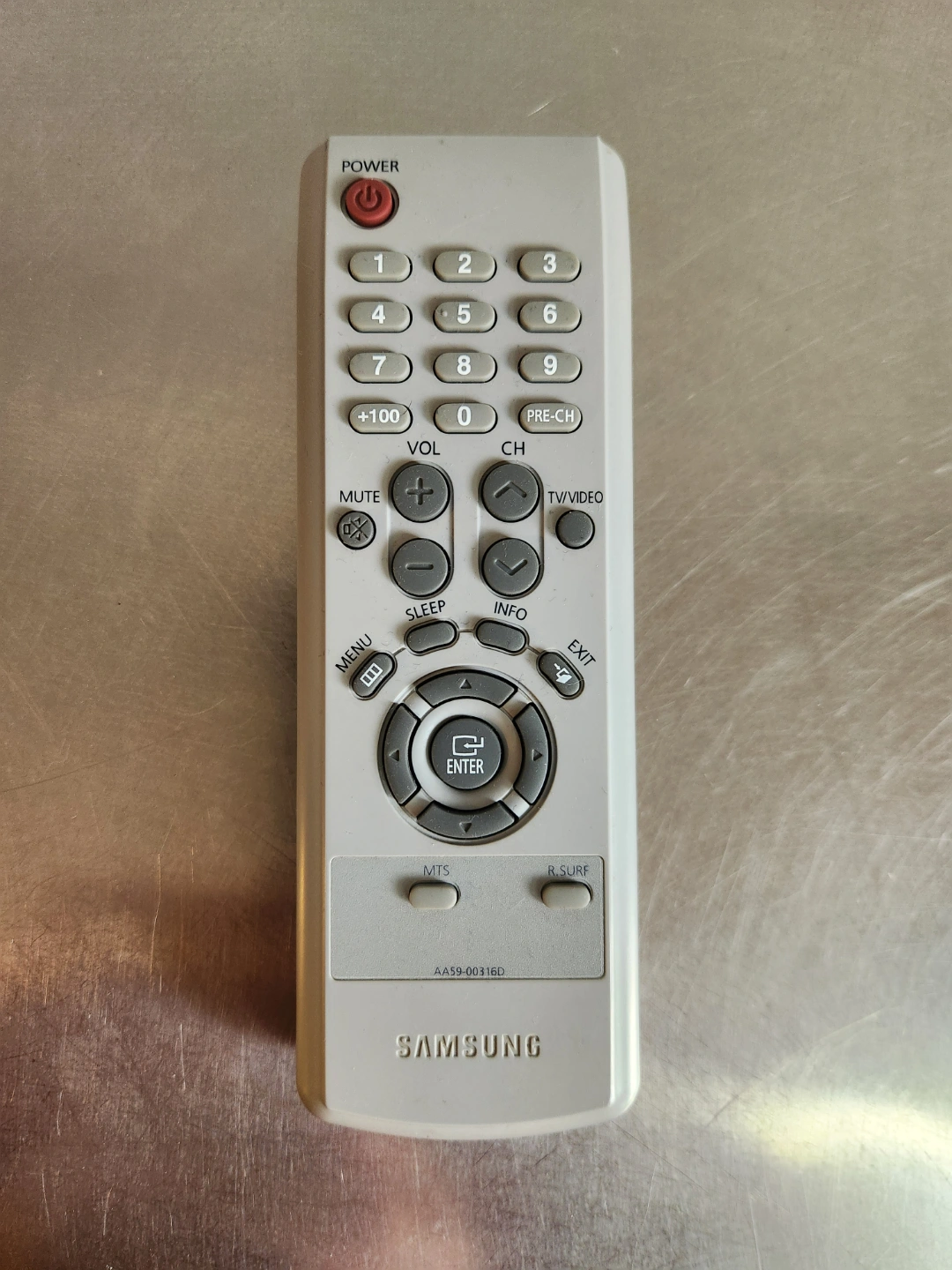 Used Samsung television remote. Model number AAS9-00318D. Features include volume, channel, sleep, mute, and more. Requires two AAA batteries.