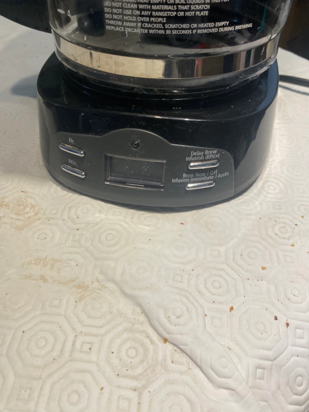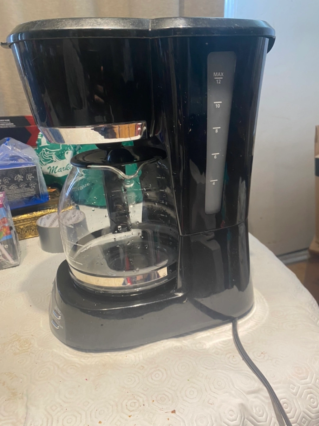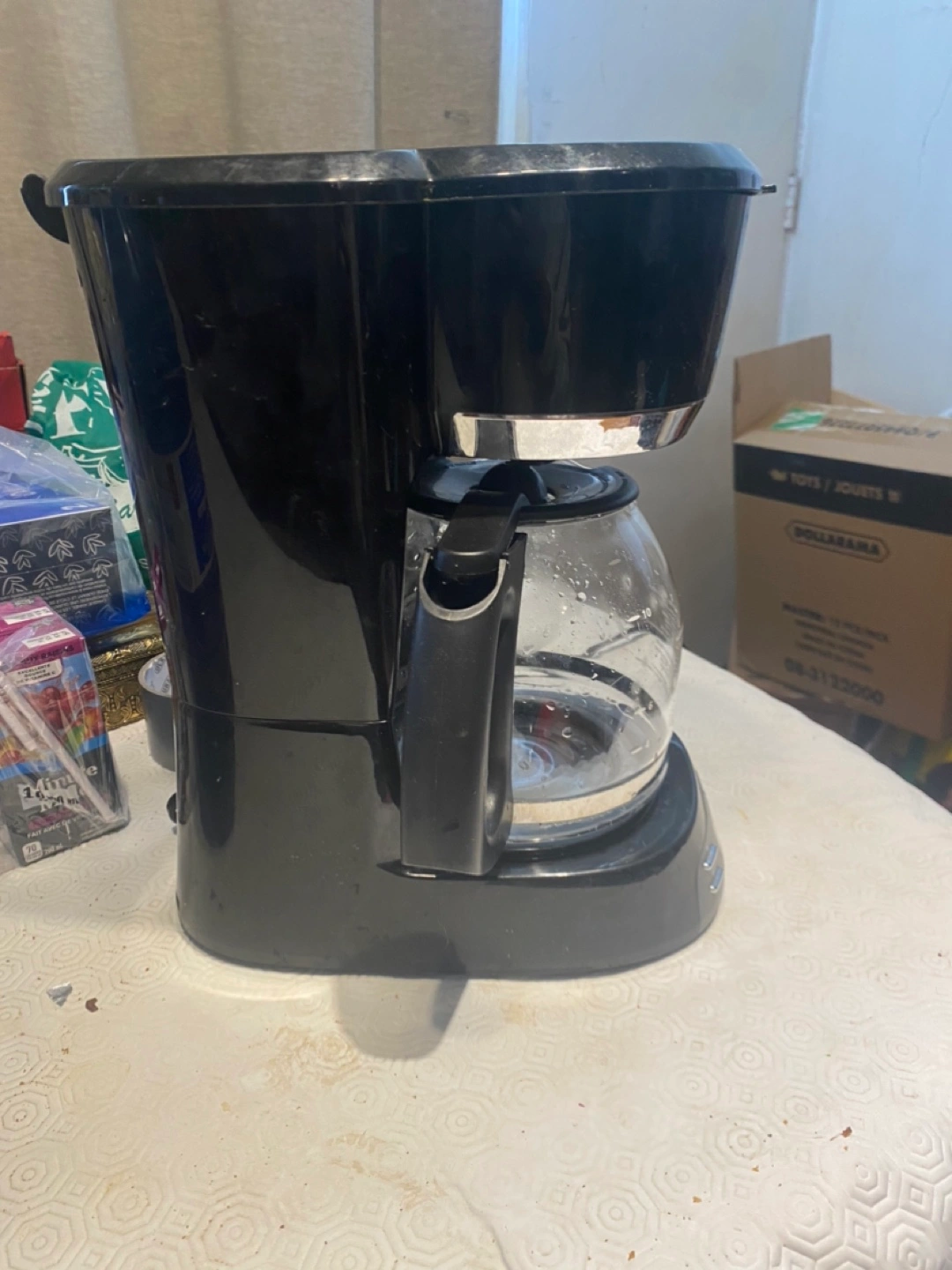 Black programmable coffee maker. Glass carafe. Delay brew function. 12-cup capacity.
