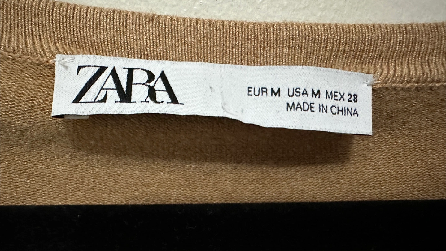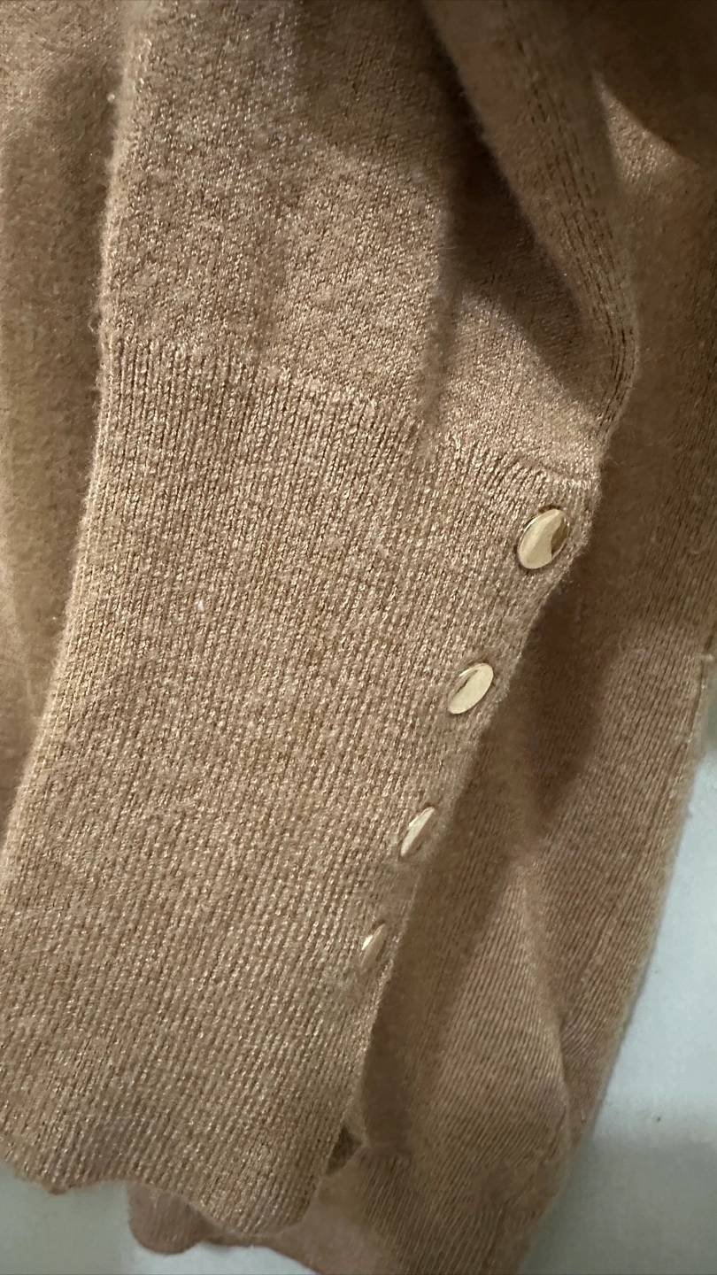 Long sleeve v-neck sweater. Medium brown color. Gold buttons on cuffs. Made in China.
