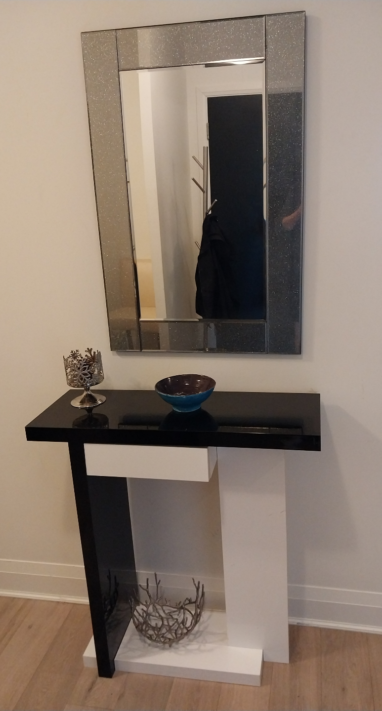 Stylish console table. Black and white finish. Sleek design. Perfect for entryway or hallway. Small drawer for storage. Includes decorative storage space.