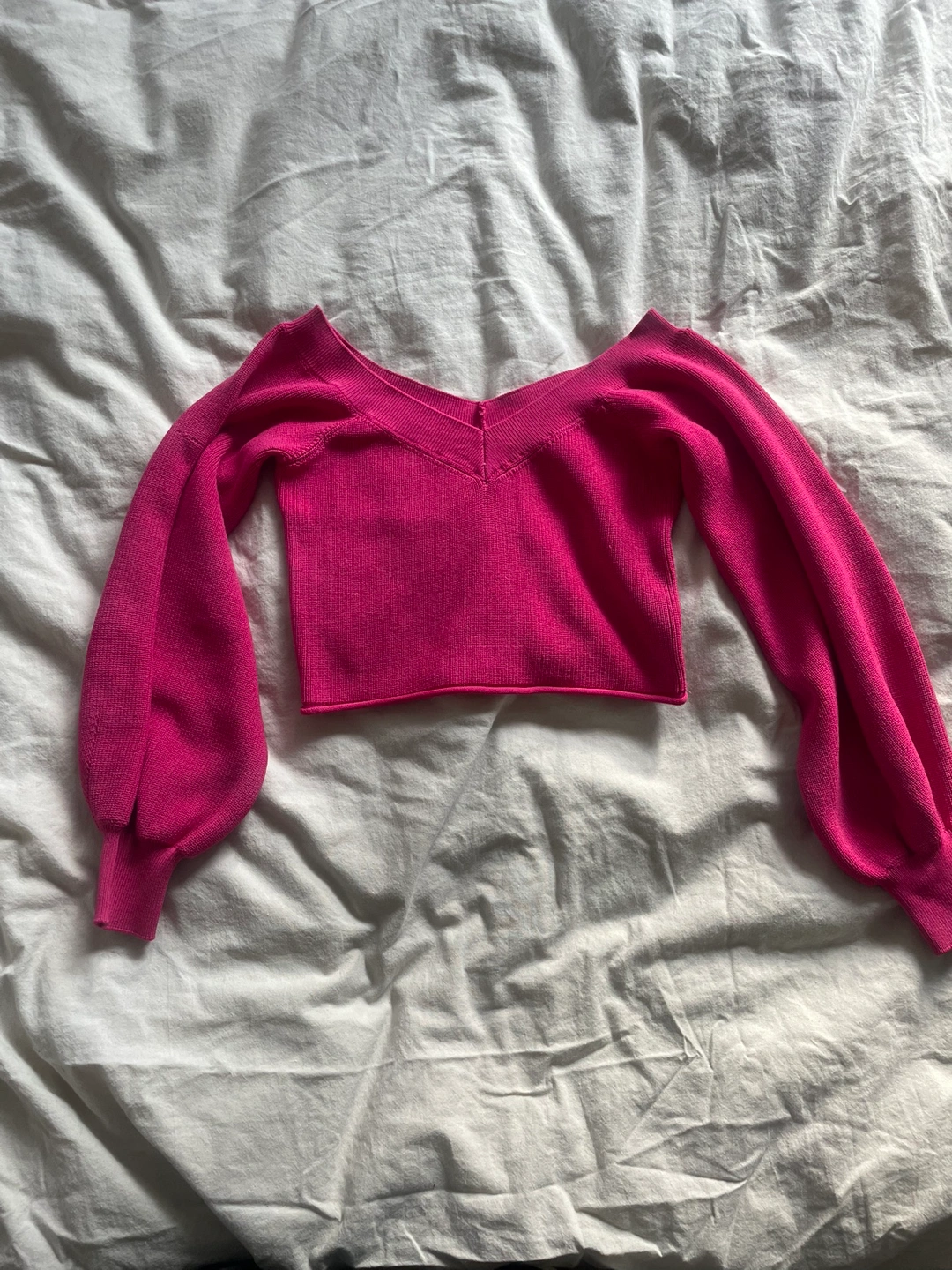 Very cropped Has puff sleeves Can be worn off the shoulder