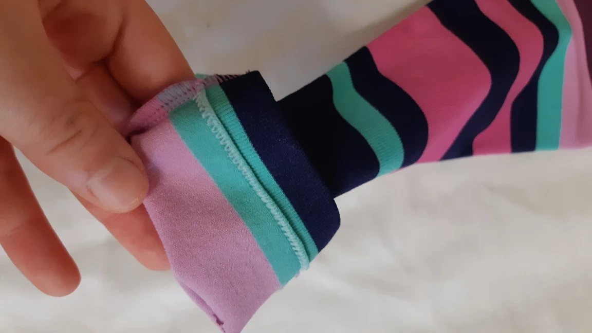 The grey one is warmer and more like sweatpants, is cuffed at bottom. The striped one is ribbed. You get both at one price.