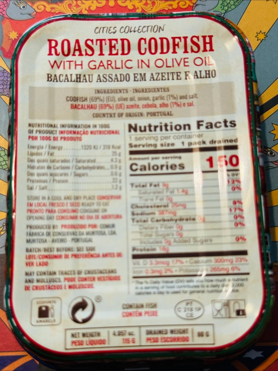 I went crazy in Lisbon, and purchased too many sardines. Hopefully, some else can enjoy one of many amazing tastes of Portugal. In a Portuguese style, our cod is grilled, seasoned with garlic and onion, and drizzled with olive oil... With the taste of a Portuguese home, the cod is rich in nutrients and low in fat. It is also a source of low-calorie protein! Perfect for recreating typical dishes of Portuguese cuisine, we recommend using it in the Bacalhau à Brás recipe or the classic Roupa Velha. Retail: $30.00 EUR