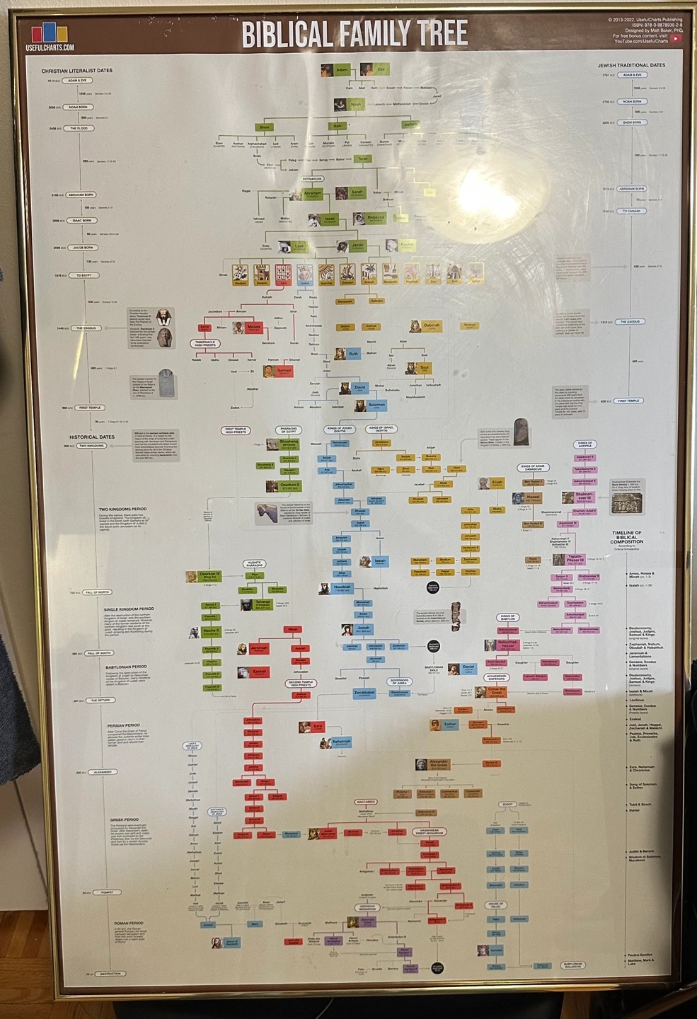 Detailed chart showing biblical genealogy and historical dates, in a gold frame. Excellent educational resource.