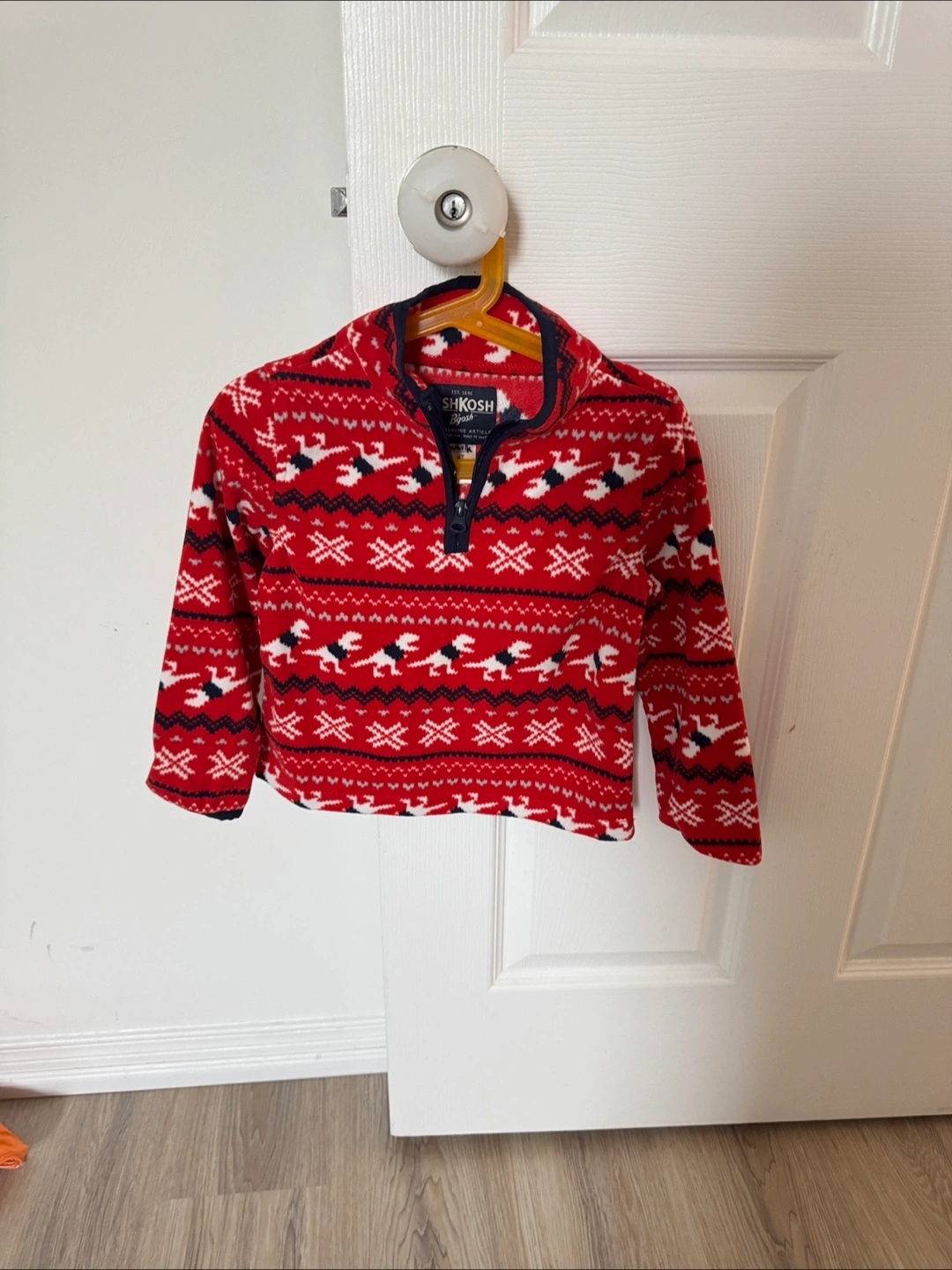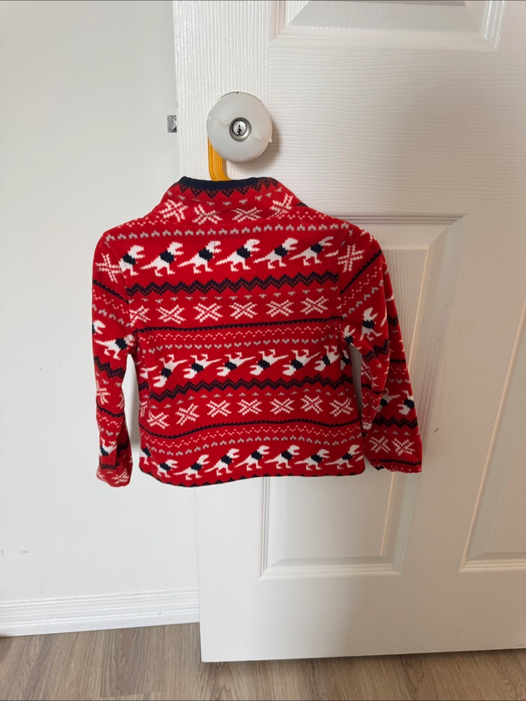 Red fleece pullover. Dinosaur and Fair Isle pattern. Half zip closure. Size 4T.hardly used. In mint condition