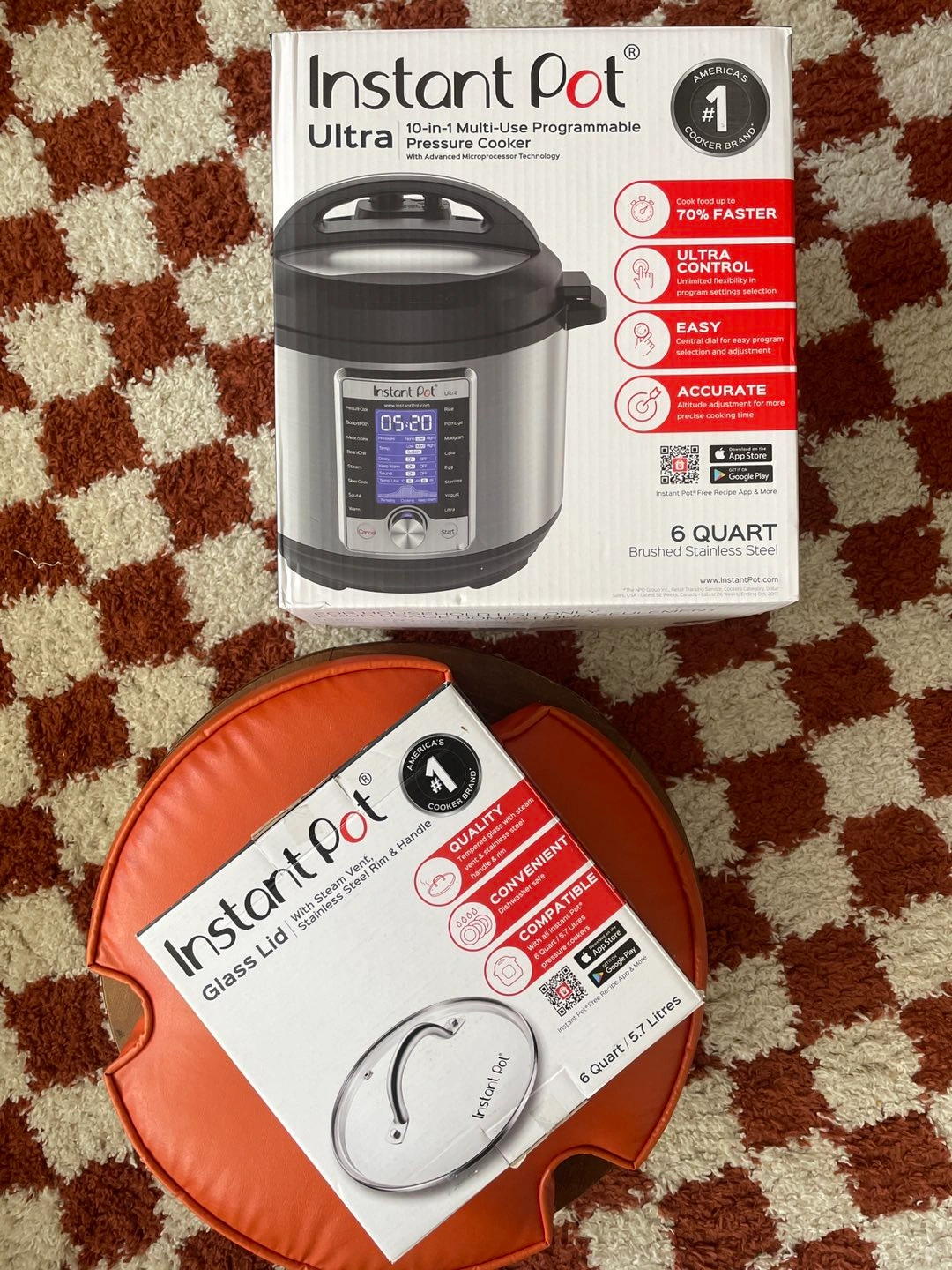 Gently used (like new and in box with all accessories and manuals), in box 6 quart Instant Pot 60 Ultra 10-1 programmable pressure cooker AND glass lid (Instant Pot Tempered Glass Lid for with Stainless Steel Rim, 9-Inch). Brand new this is a $200 appliance purchase.