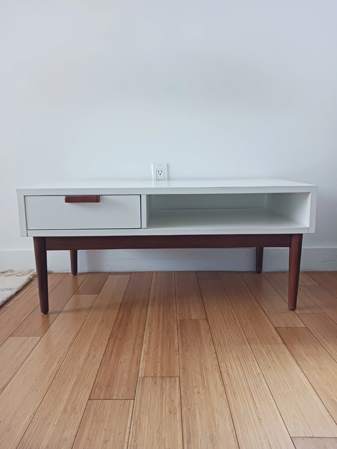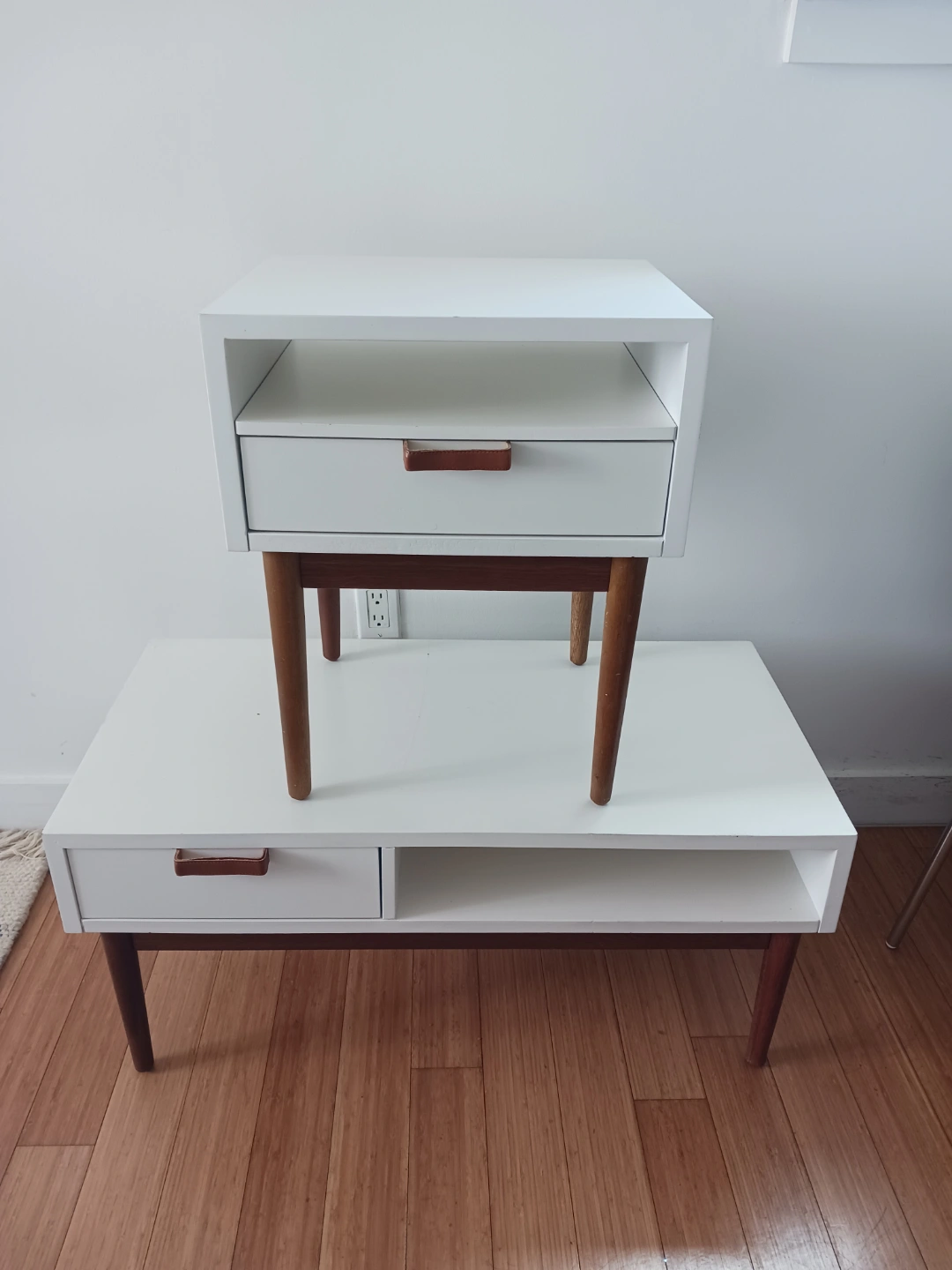 Matching white nightstand and coffee table. Mid-century modern style. Both feature a single drawer and open lower shelf. Brown wooden legs. Good condition.