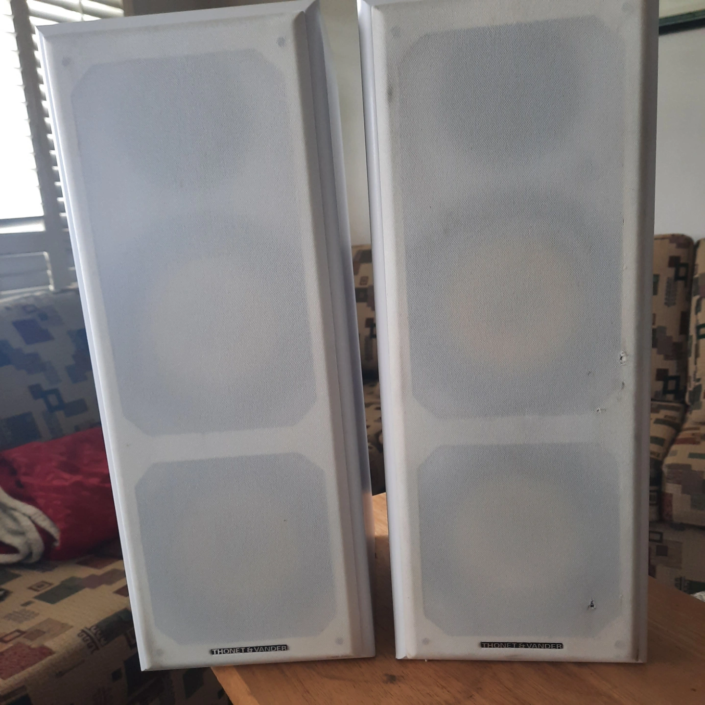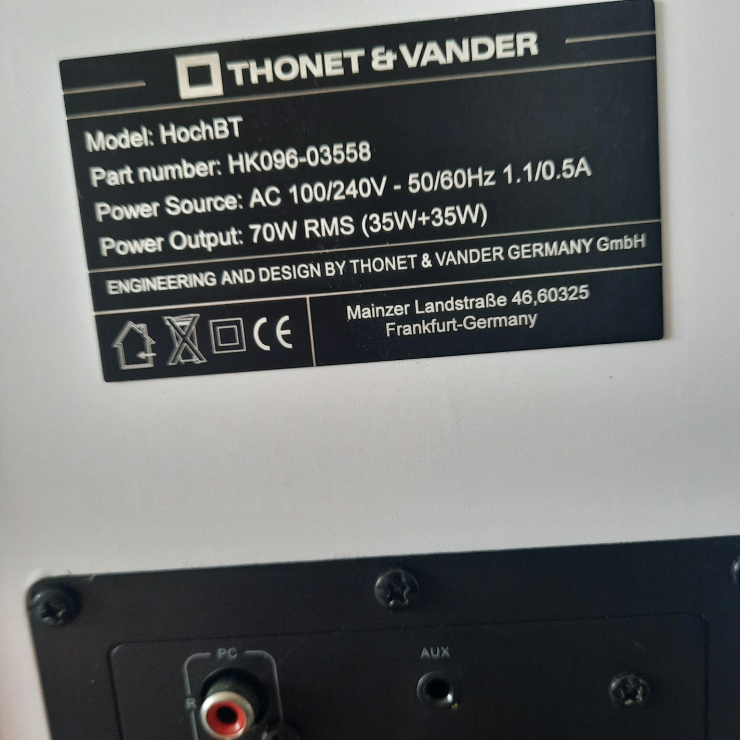Pair of white Thonet & Vander HochBT speakers. 70W RMS. Includes power cords. Good condition.