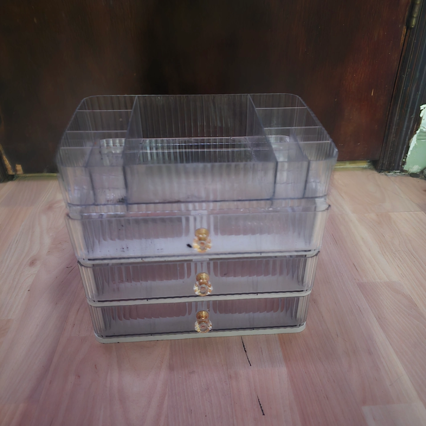 Stackable organizer. Three drawers and multiple top compartments. Clear plastic with gold-colored drawer knobs. Great for makeup, jewelry, or other small items.
