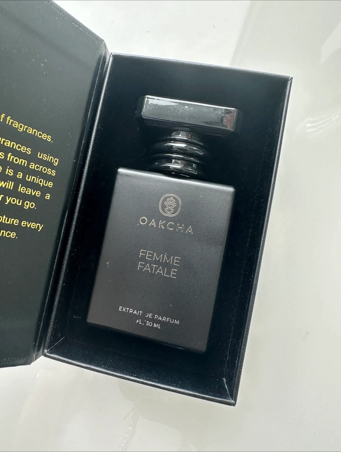 1000+Oakcha Femme Fatale extrait de parfum. 30ml bottle. Black box packaging. Elegant and sophisticated scent.