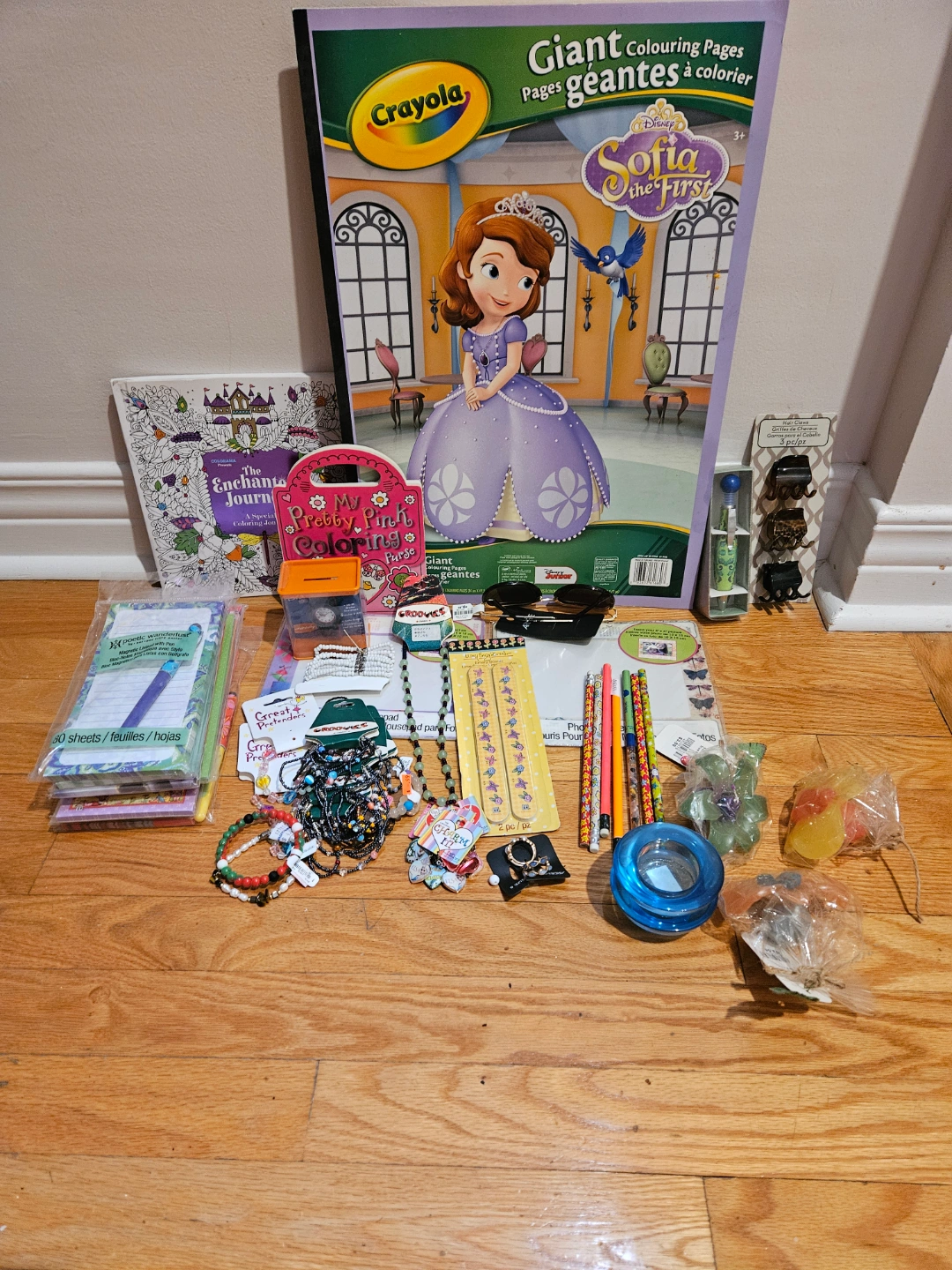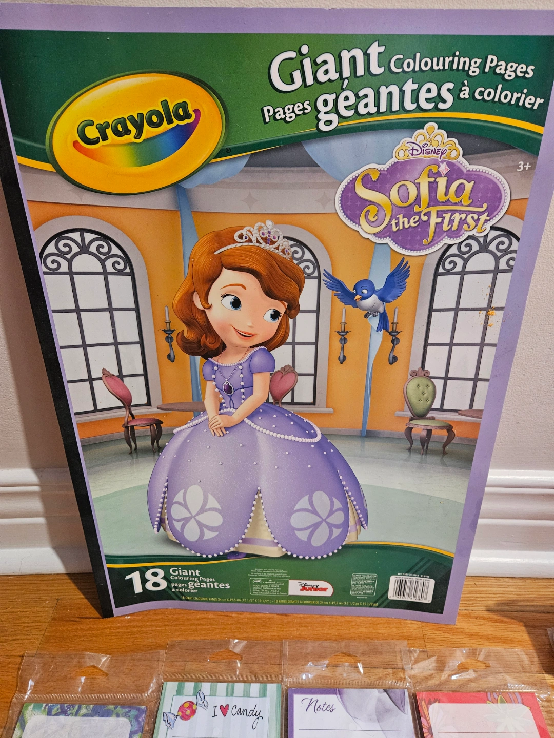 All New. Large bundle of colouring books and accessories. Includes adult colouring book, The Enchanted Journey by Colorama; 8 magnetic listpads children's colouring book, Disney Sofia the First by Crayola; bunch of beaded braclets 3 waxed flower candles 7 Disney charms Great for kids or adults who enjoy creative activities. sold as a bunch or individual only best offer pls.