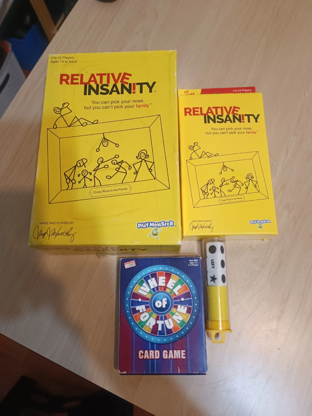 Two Relative Insanity board games, one larger and one smaller. Includes Wheel of Fortune card game and dice. PlayMonster brand.
