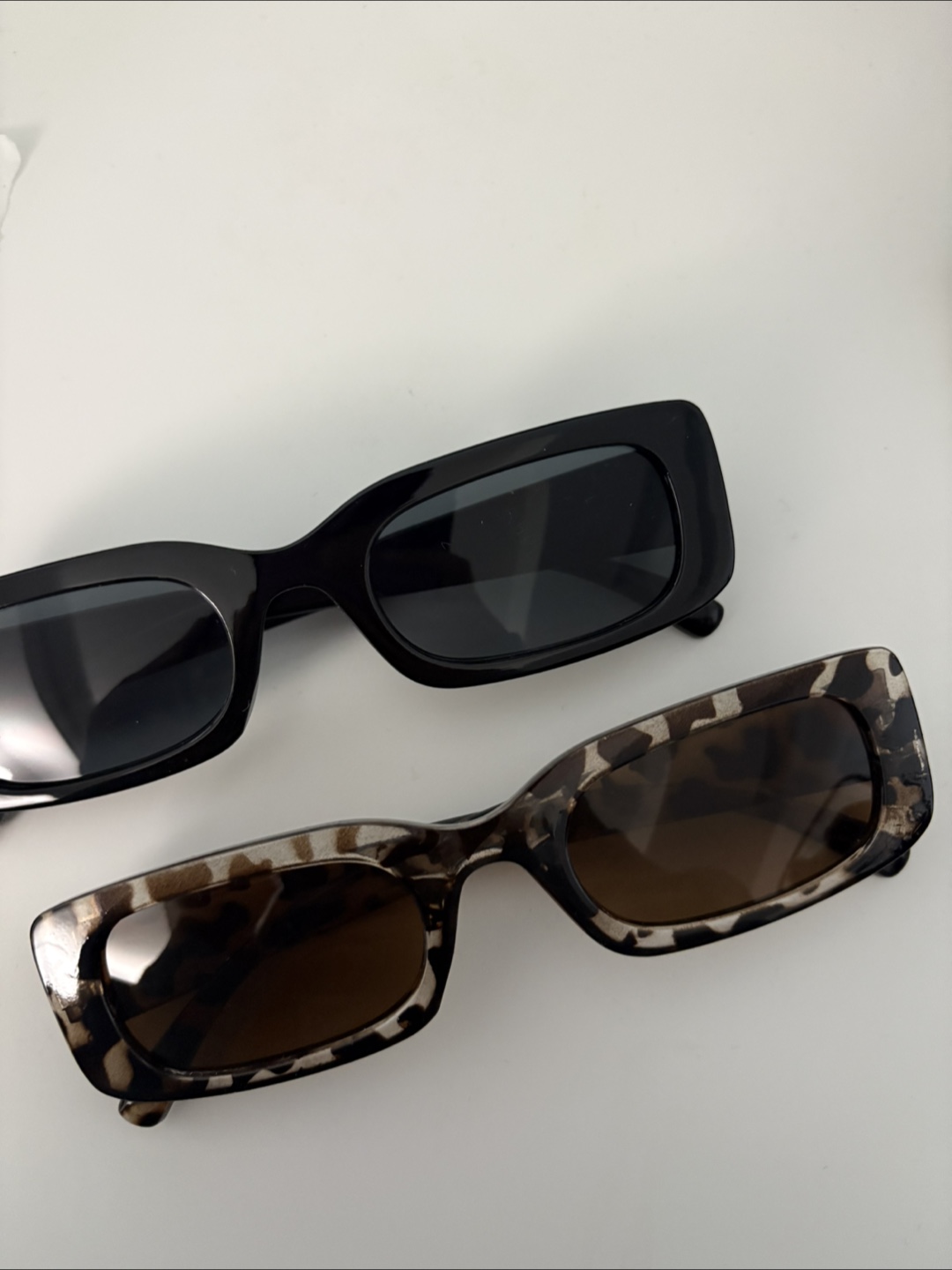 Pair of black rectangular sunglasses. Another pair of tortoiseshell rectangular sunglasses. Both pairs are in good condition.