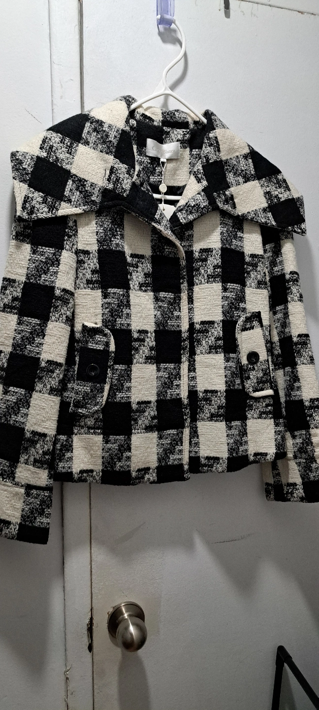 Women's cropped jacket. Black and white gingham pattern. Oversized collar. Button closure. Two patch pockets.