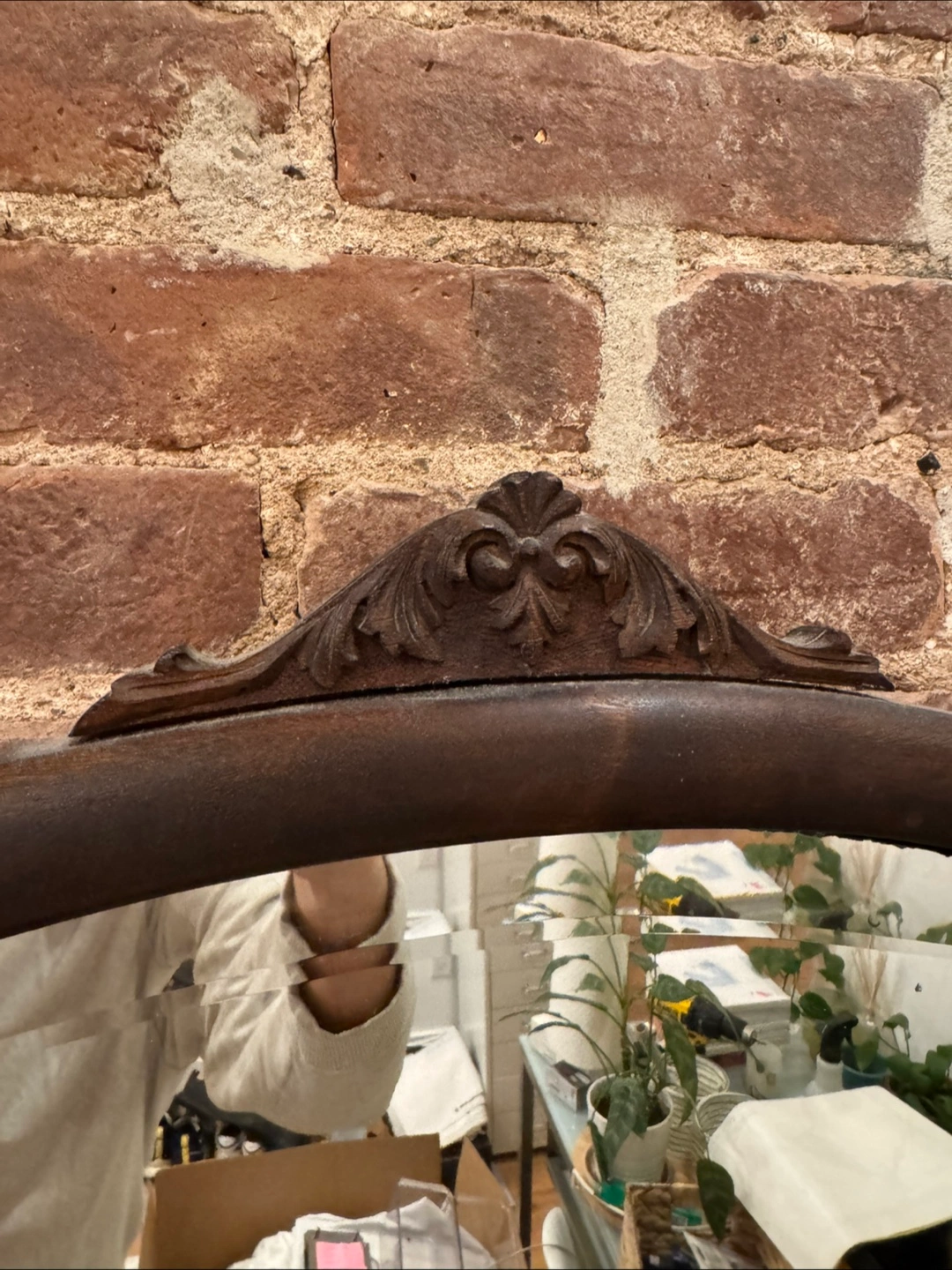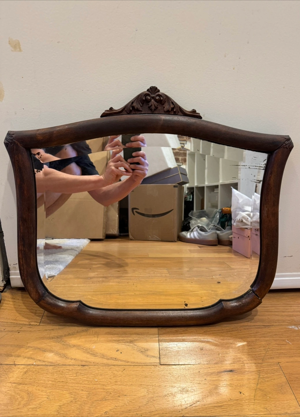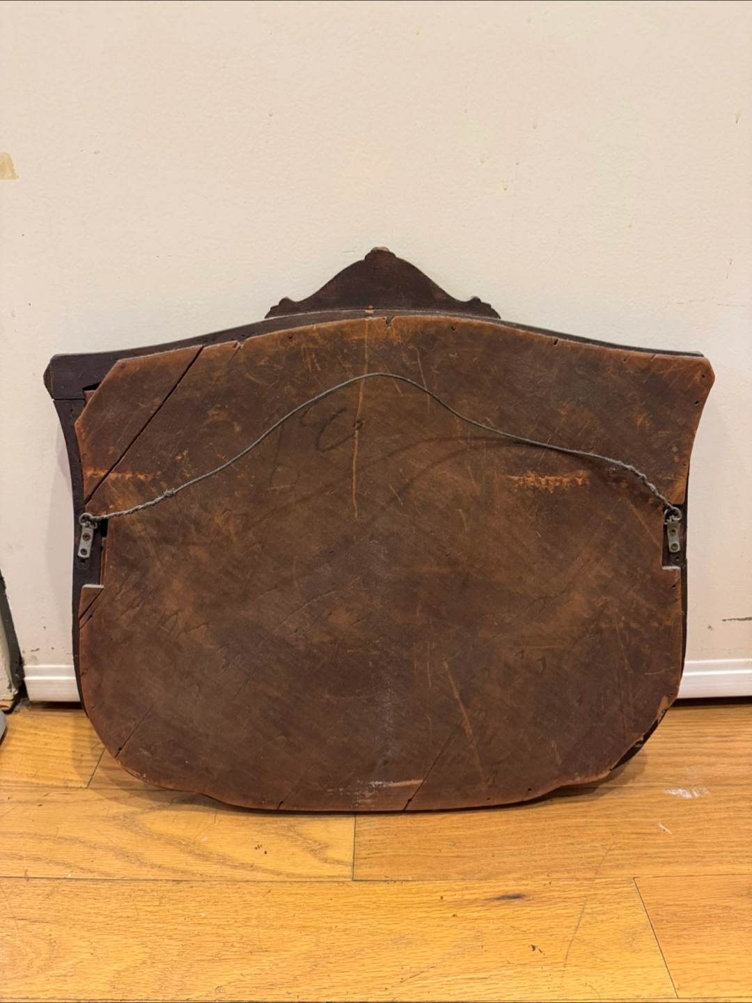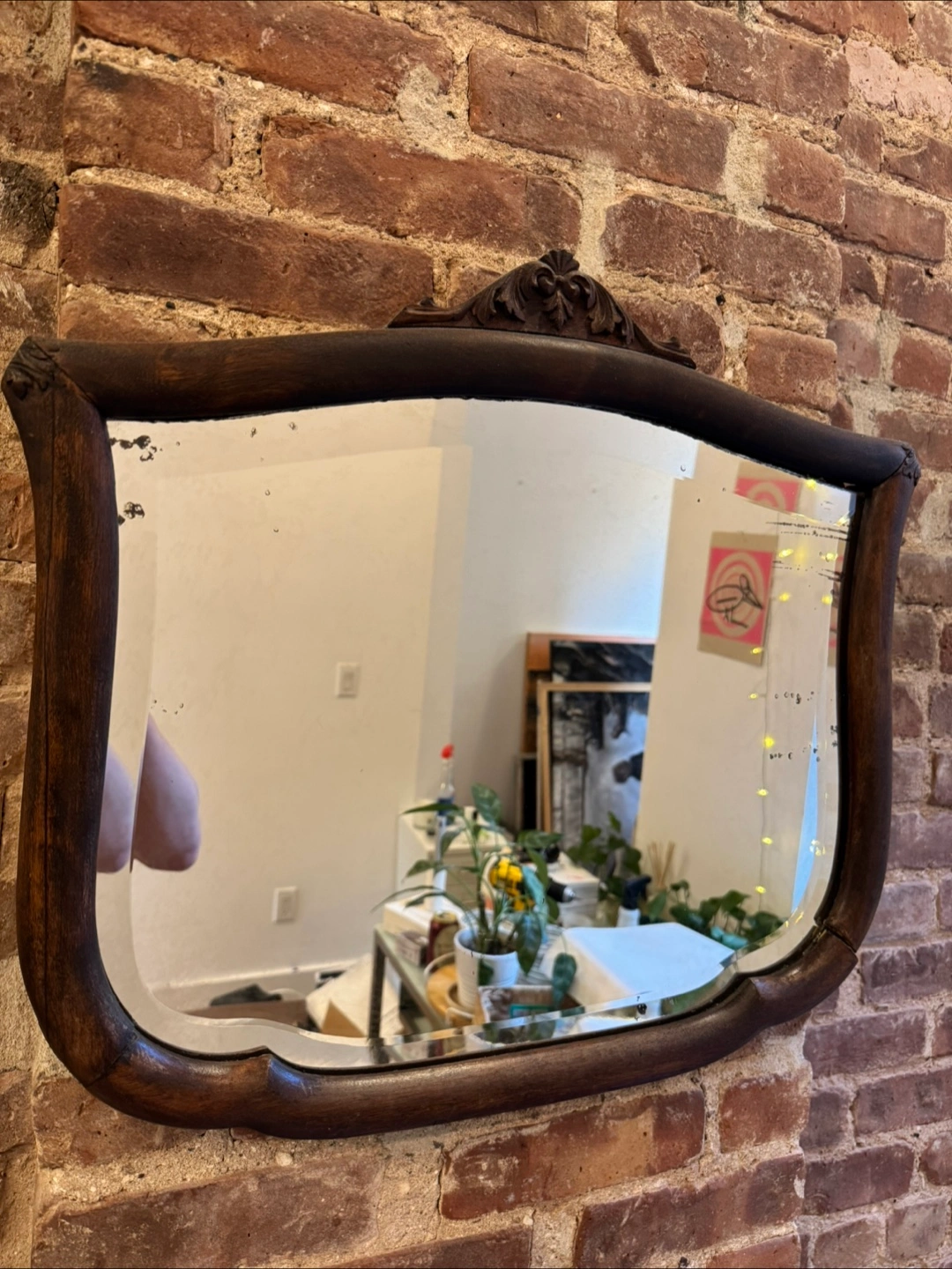 Vintage wall mirror. Dark wood frame, slight damage to corner. Ornate detailing on top. Ready to hang.