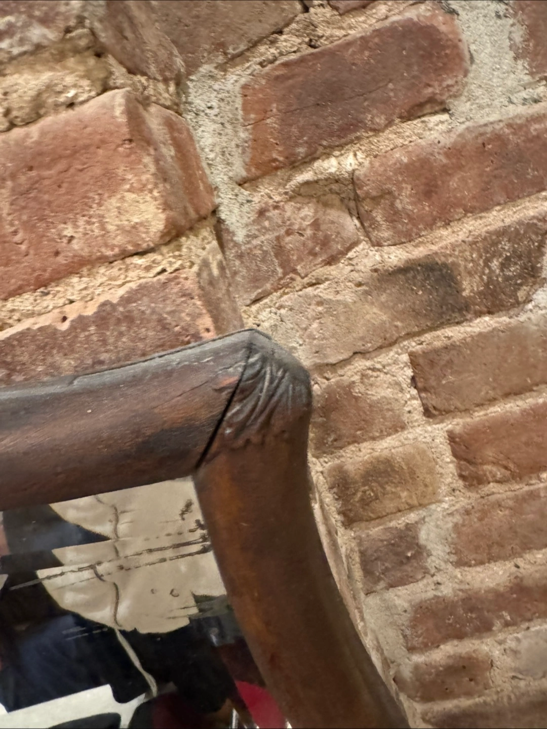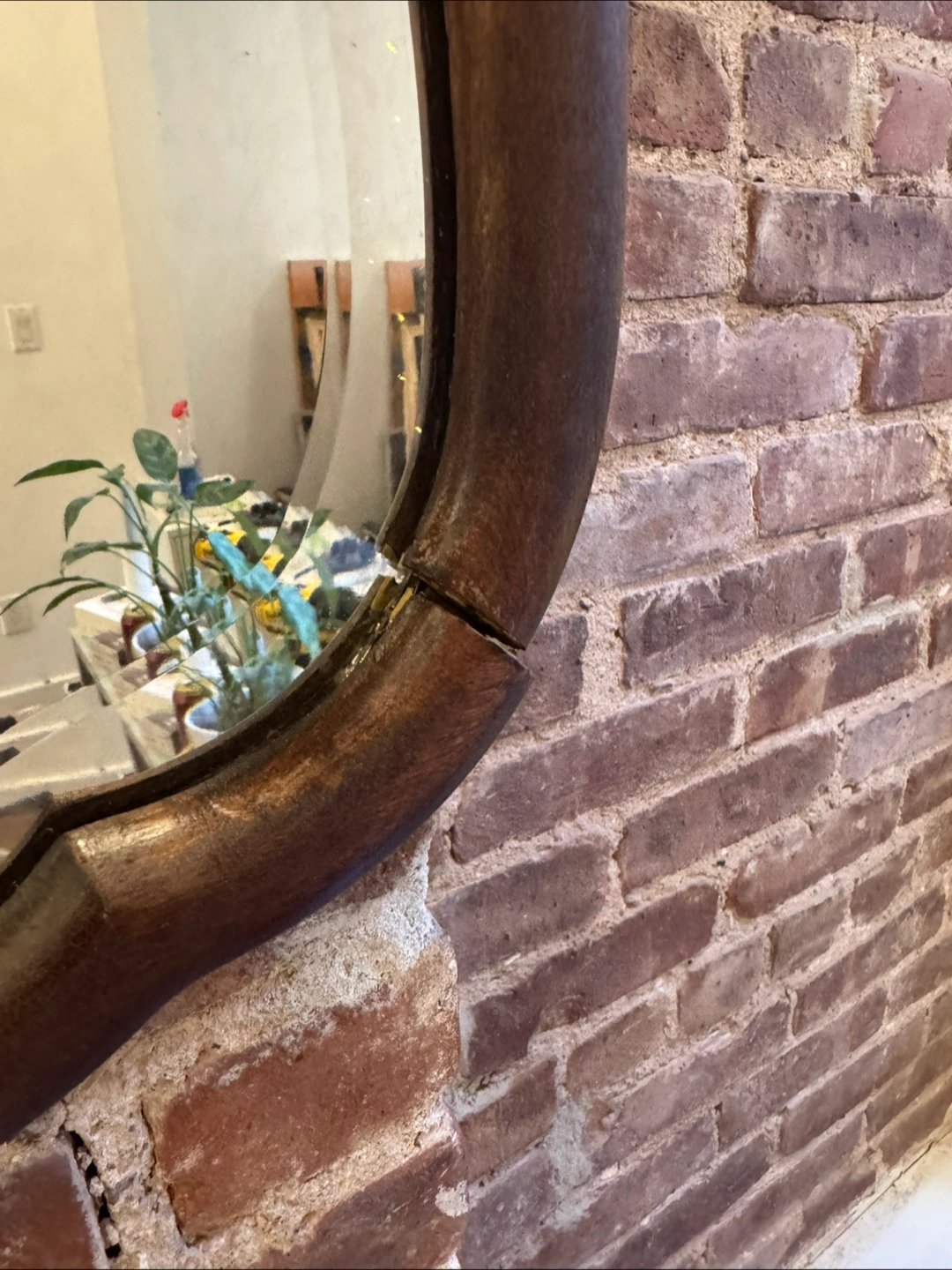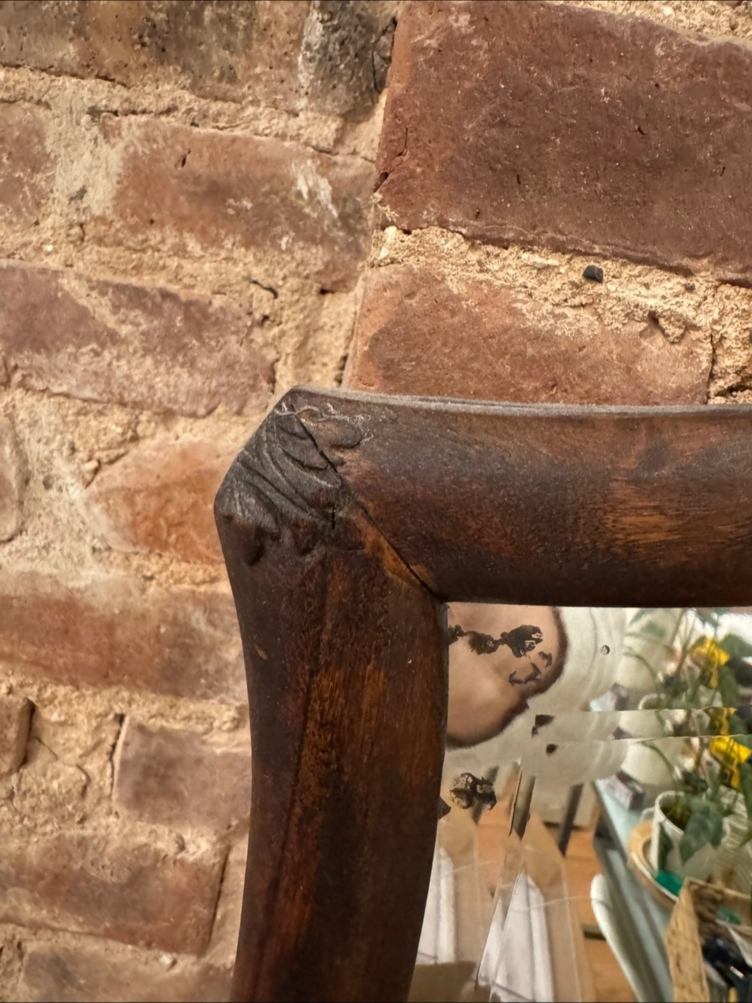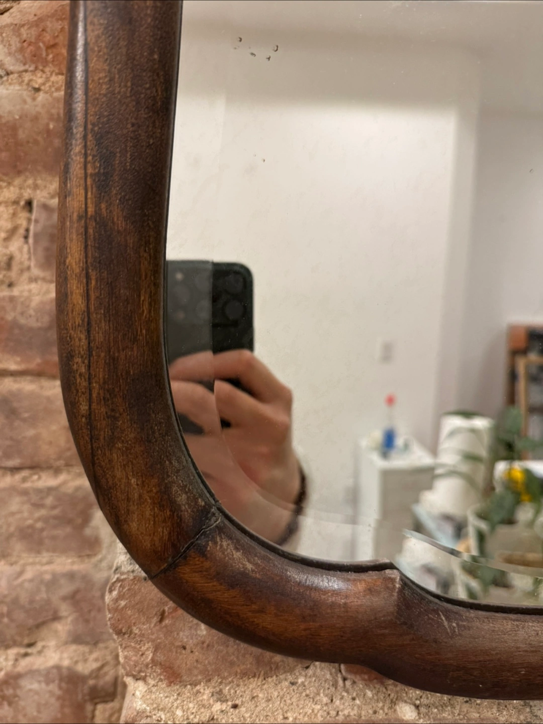 Vintage wall mirror. Dark wood frame, slight damage to corner. Ornate detailing on top. Ready to hang.