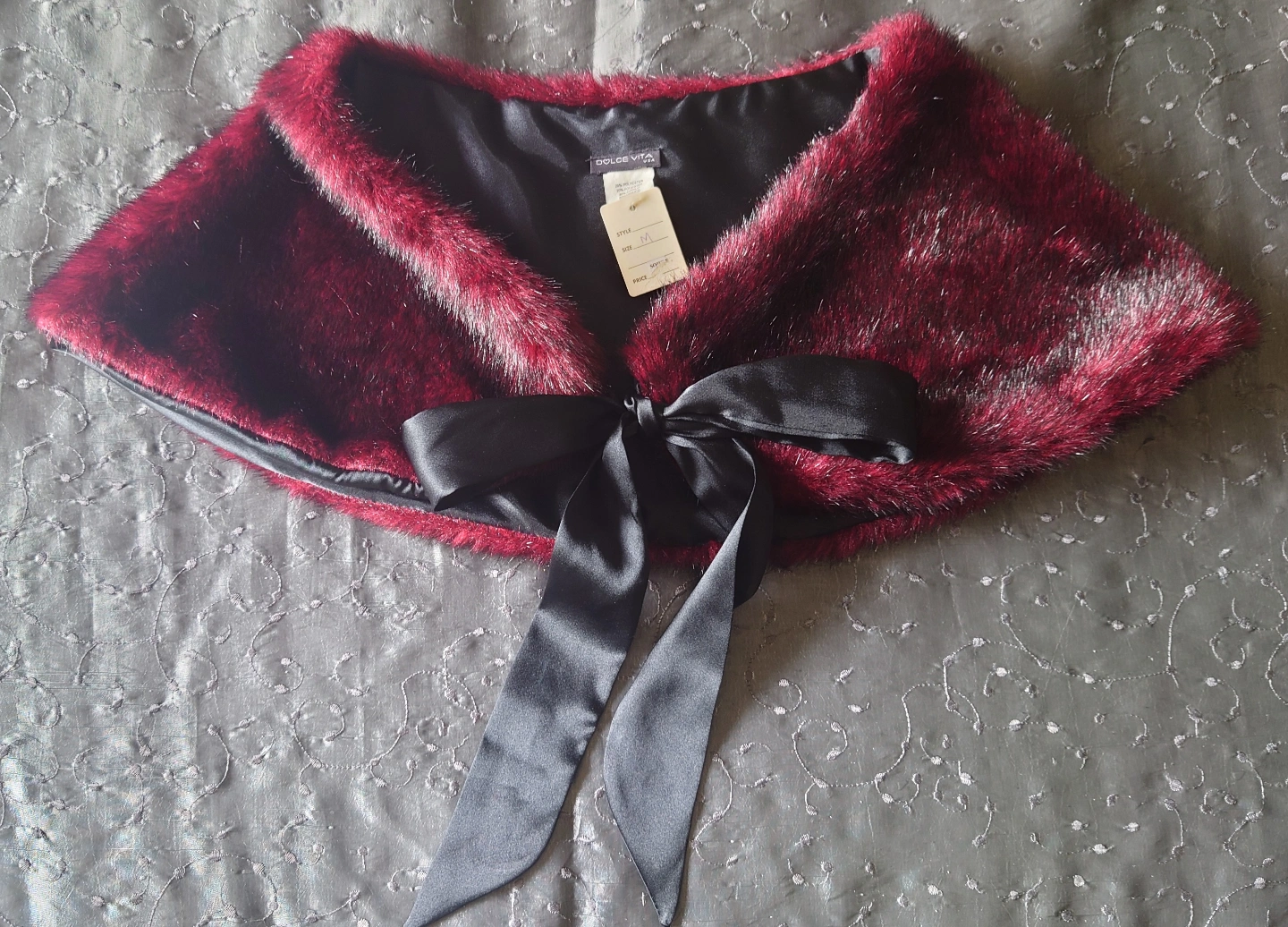 Faux Fur Capelet / Shoulder Wrap / Shrug with Satin Lining and ties in a beautiful wine burgundy with black tips. New with tags