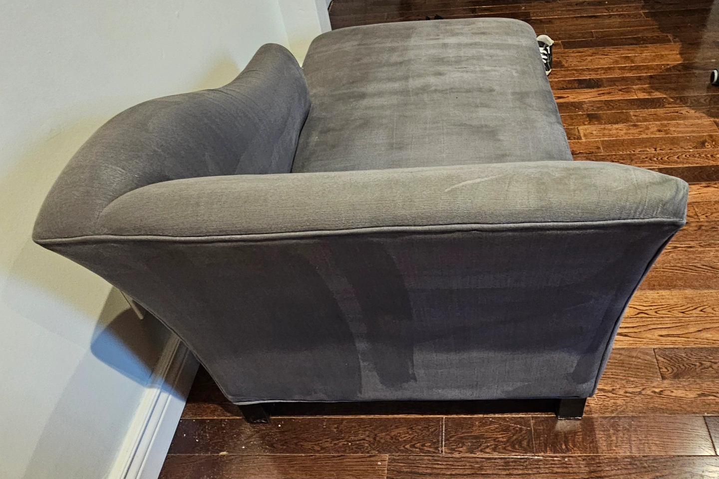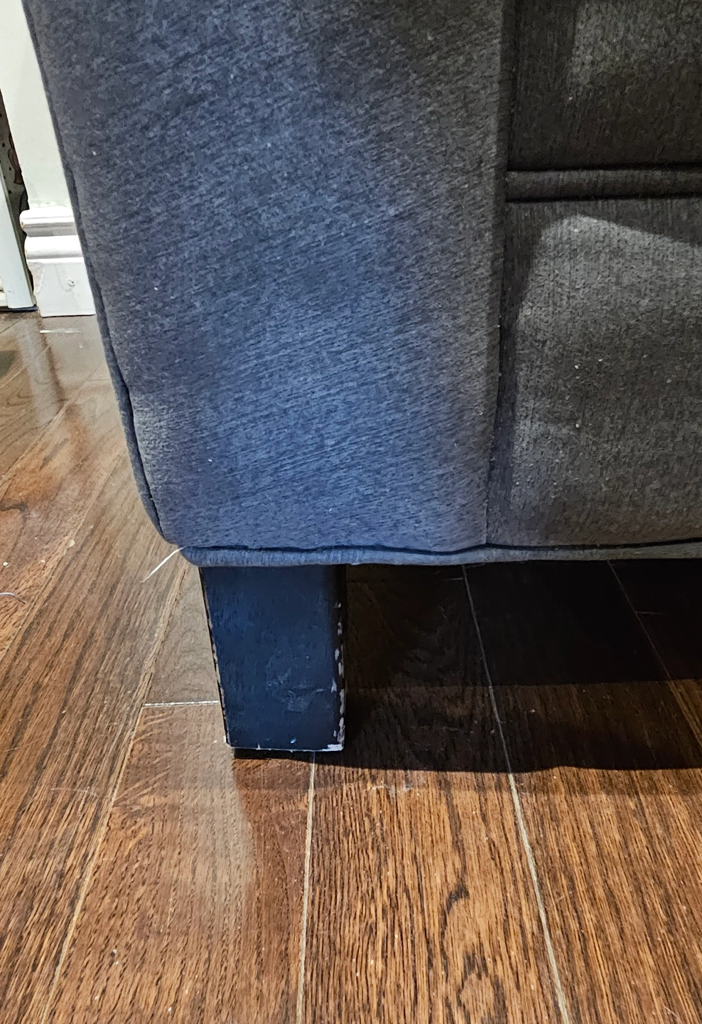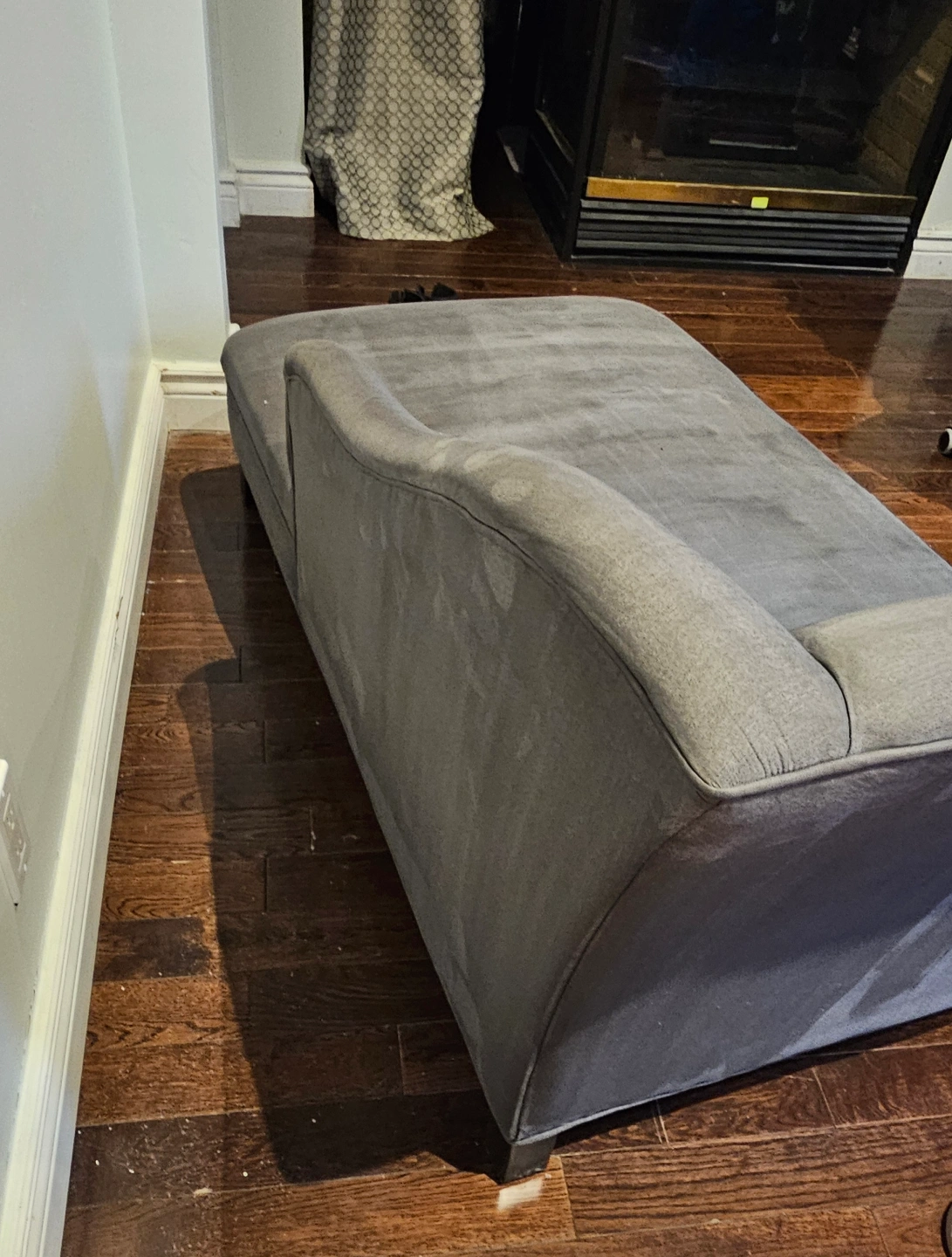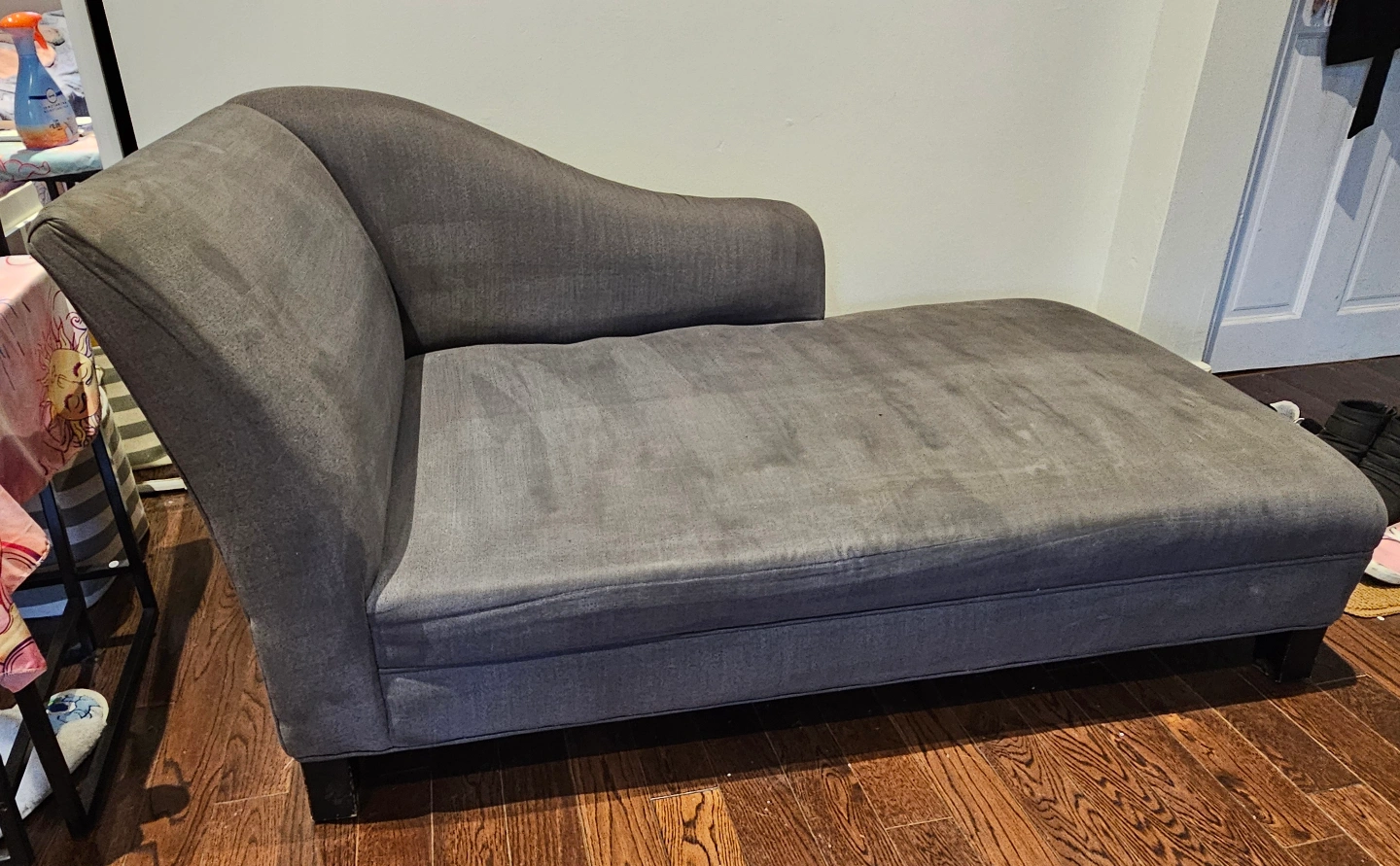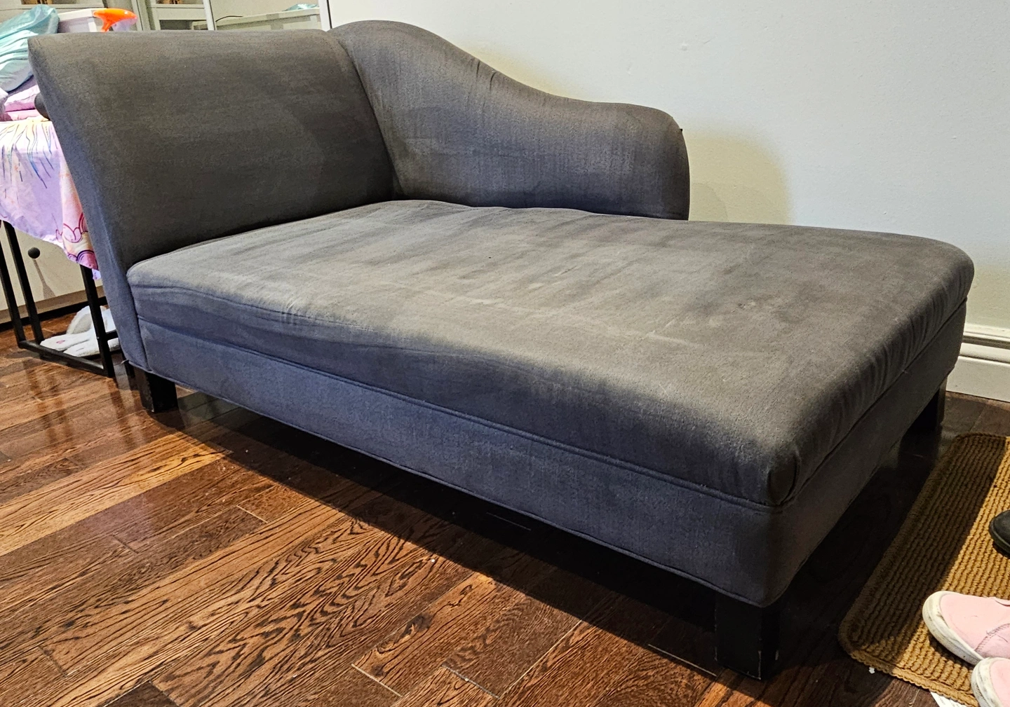 Comfortable chaise lounge. Dark grey fabric. used but very good condition. Solid wood legs but I needed to cut off to get it in my apartment, you can just assemble legs from Ikea or temu if you want it higher. Great for relaxing.
