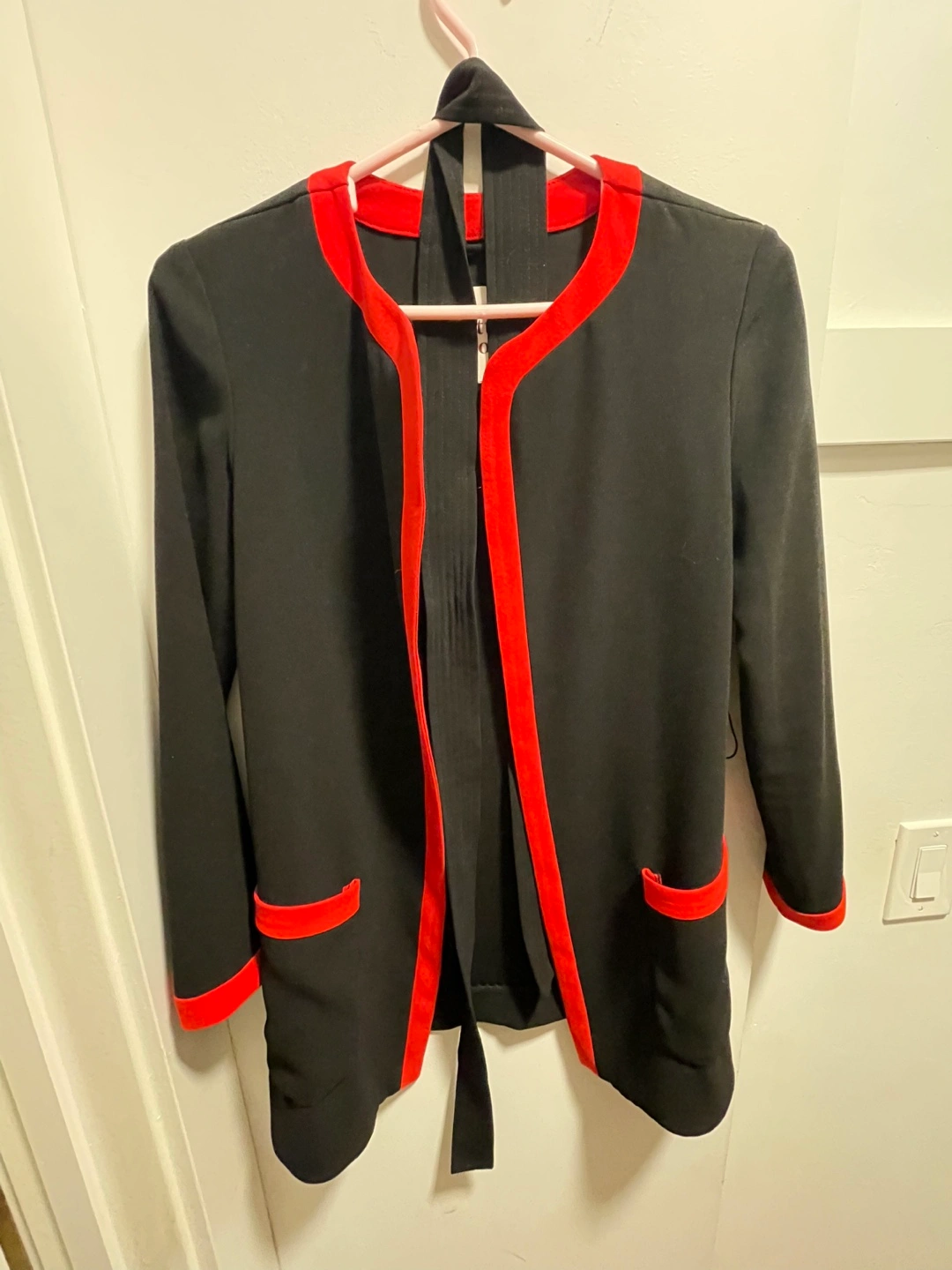Black blazer with red trim - the material is thick and feels really lovely. It says a Size XXS but I would say this fits a small - I’m a small-medium and it fits me (a little small on me). It has Long sleeves and two front pockets. Open front with a belt