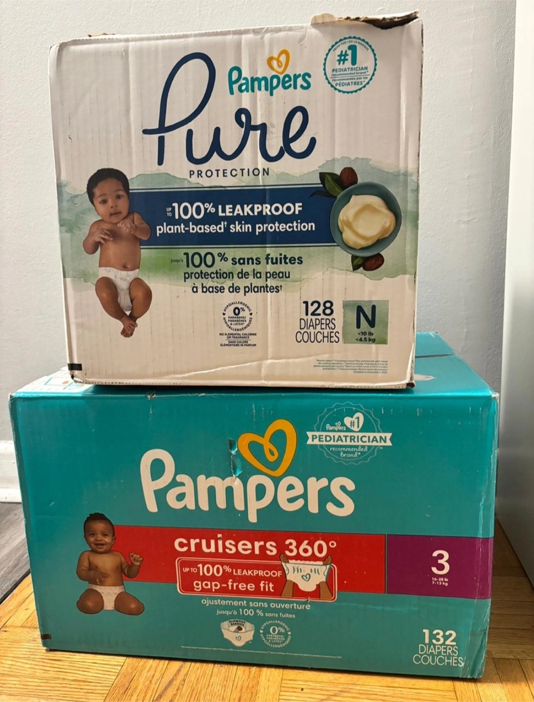 Two boxes of Pampers diapers. One box of Pure Protection size N (128 diapers) and one box of Cruisers 360 size 3 (132 diapers). New, unopened.