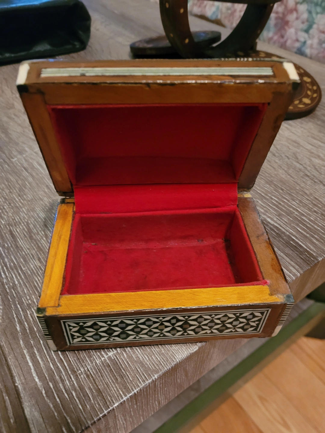 Small wooden trinket box. Intricate mother of pearl inlay. Red velvet interior. Slight wear consistent with age.