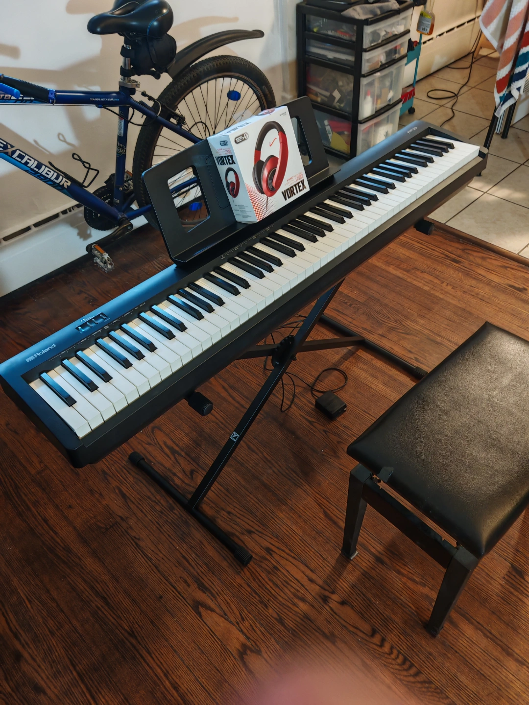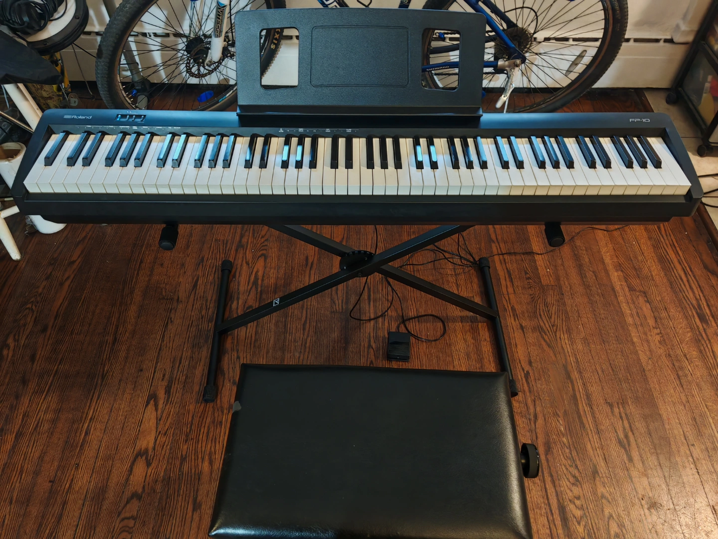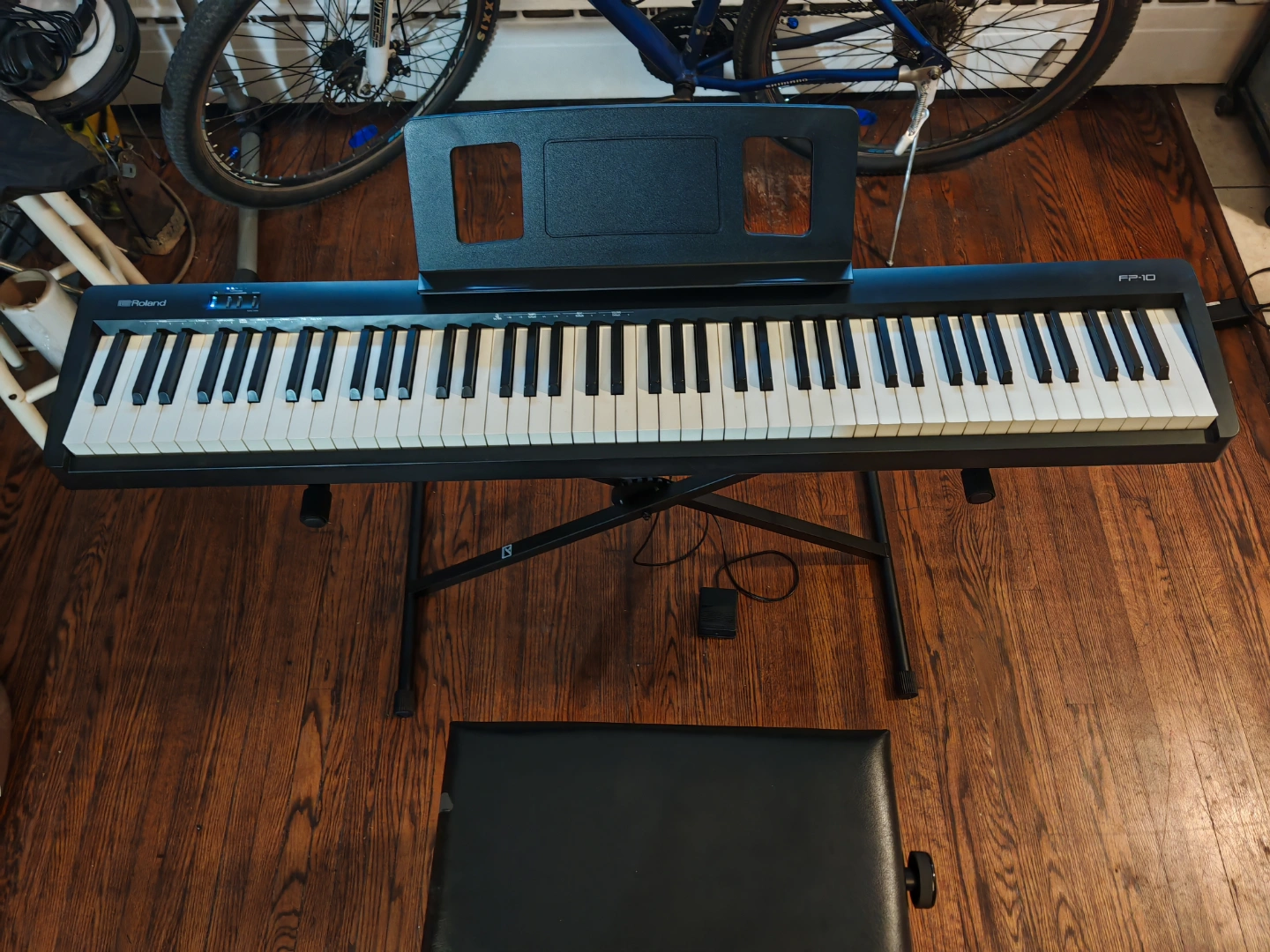 Roland FP-10, 88 fully weighted keys digital piano like new condition. It comes with stand, music rest, power adapter, headphones, sustain pedal and bench. The FP-10 isn't just for advanced players and is also the perfect quality instrument to get you started. This is what I love about digital pianos – they are for everyone no matter what the level. With 88 weighted keys and a great all round action, I was very happy indeed with my time on the Roland FP-10.