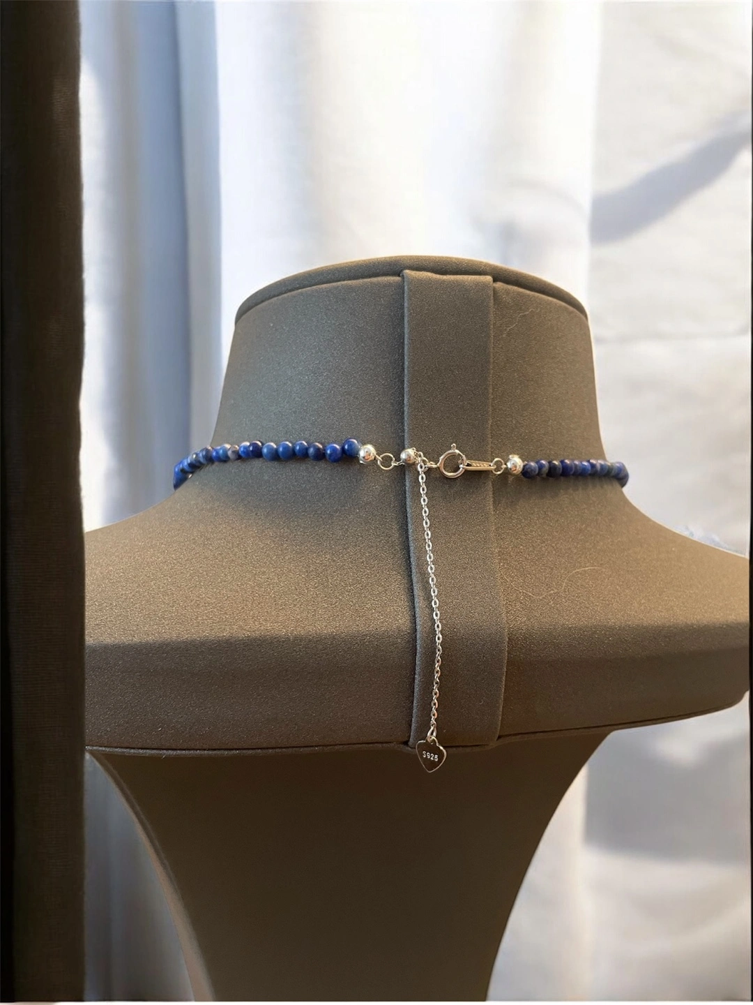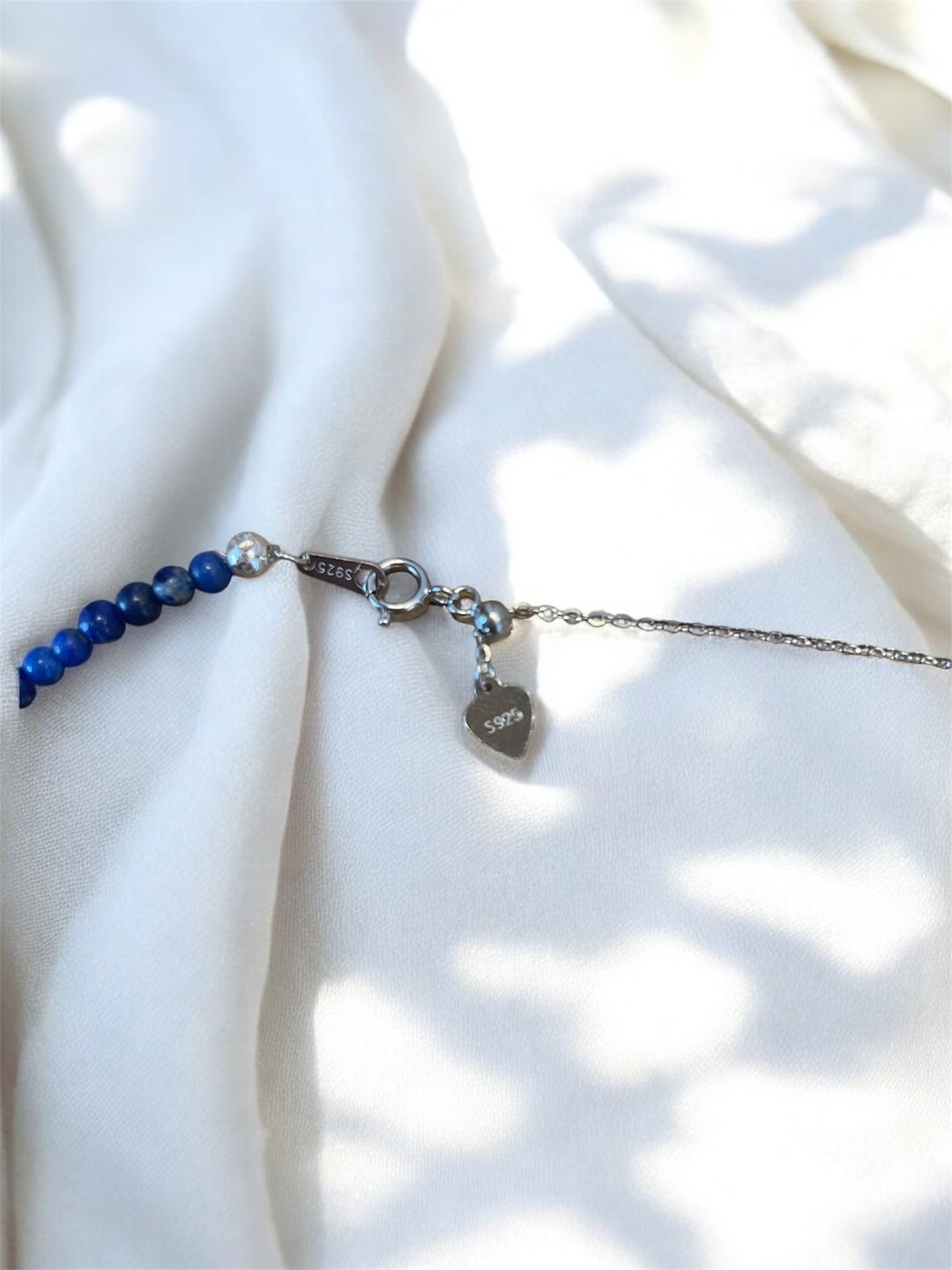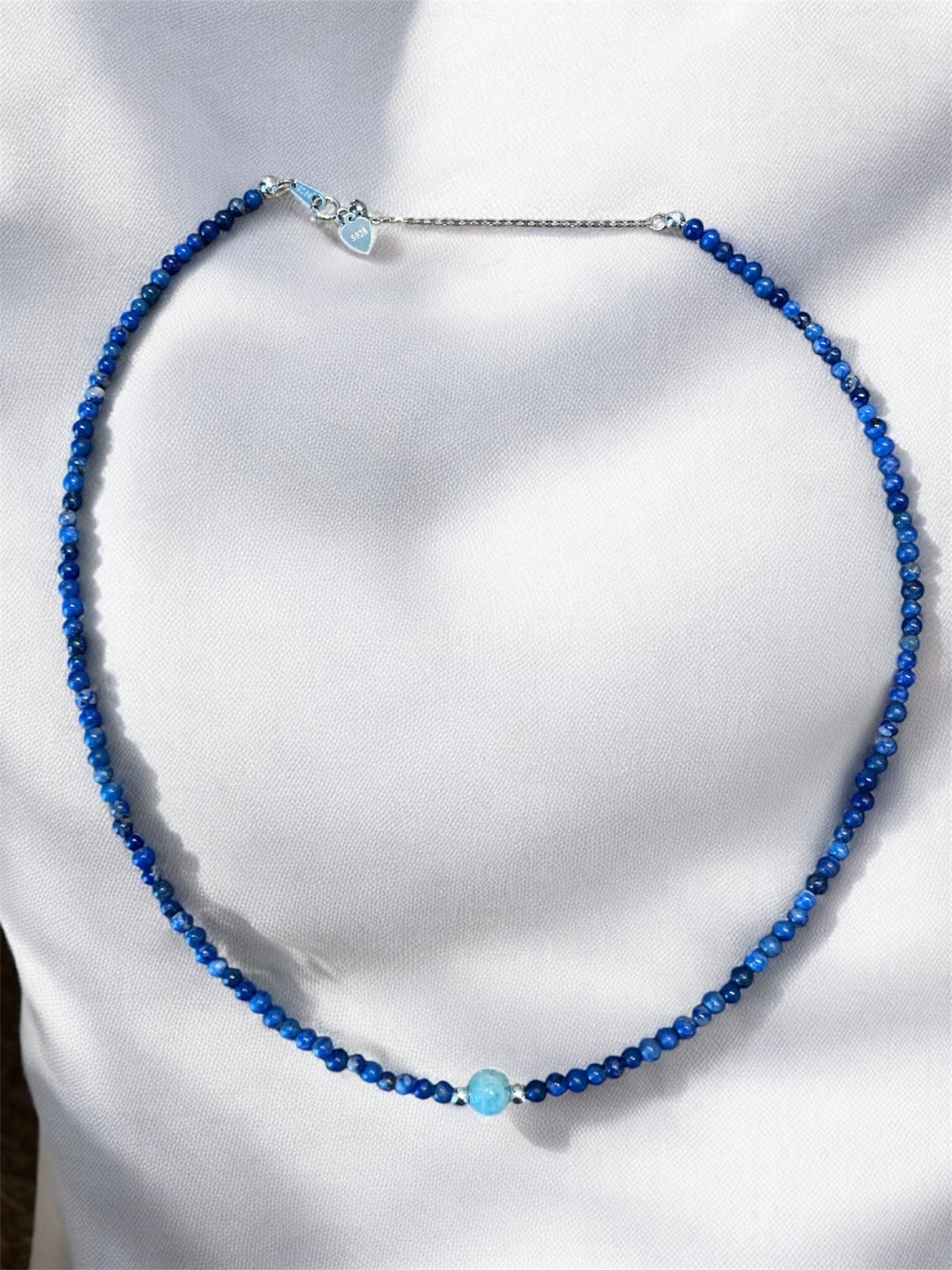 Delicate necklace featuring lapis lazuli , sterling silver and aquamarine beads. Sterling silver clasp and extender. Beautiful blue tones.
