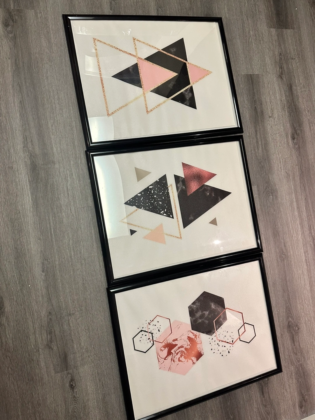 10Three framed prints. Black, pink, and rose gold geometric designs. Modern minimalist style. Perfect for home décor.