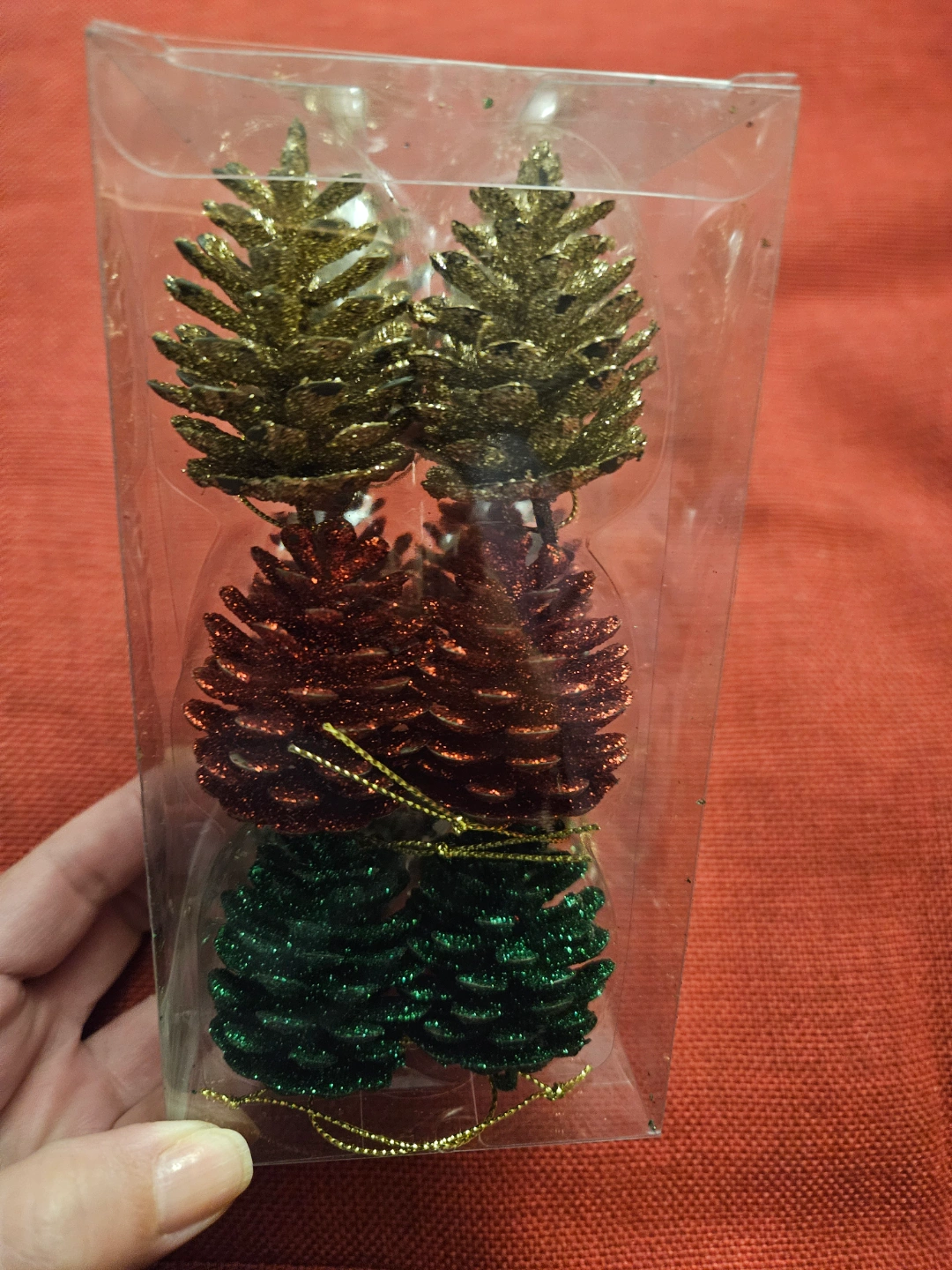 Six sparkly pine cone Christmas tree ornaments. Three colours: gold, red, and green. Perfect for decorating your Christmas tree. New, in original packaging.