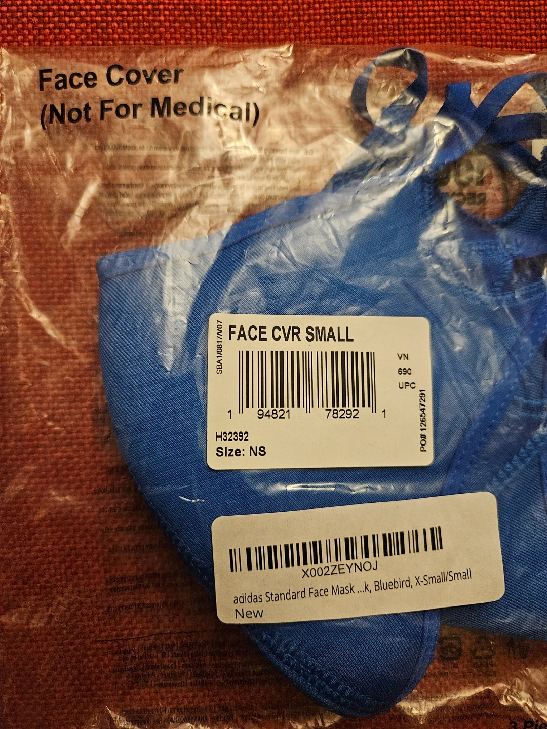 New Adidas kids face mask. Bluebird colour. Size Small. Not for medical use. Comes with 2 in the pack.