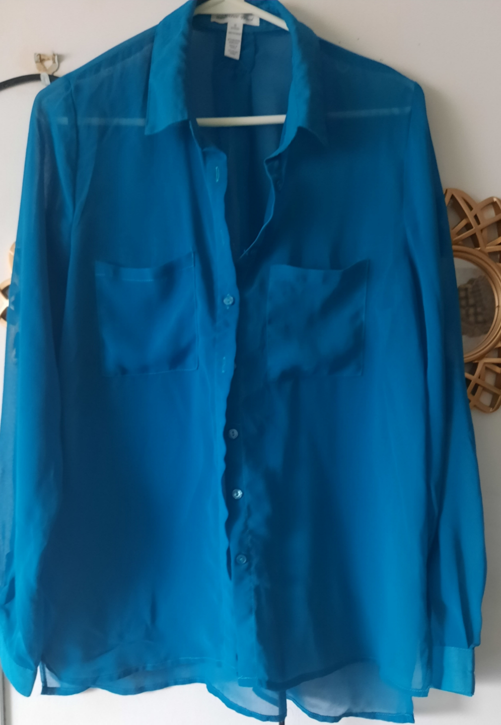 Long-sleeve button-down shirt. Teal blue colour. Sheer fabric. Two chest pockets. Relaxed fit. Great for layering or wearing on its own.
