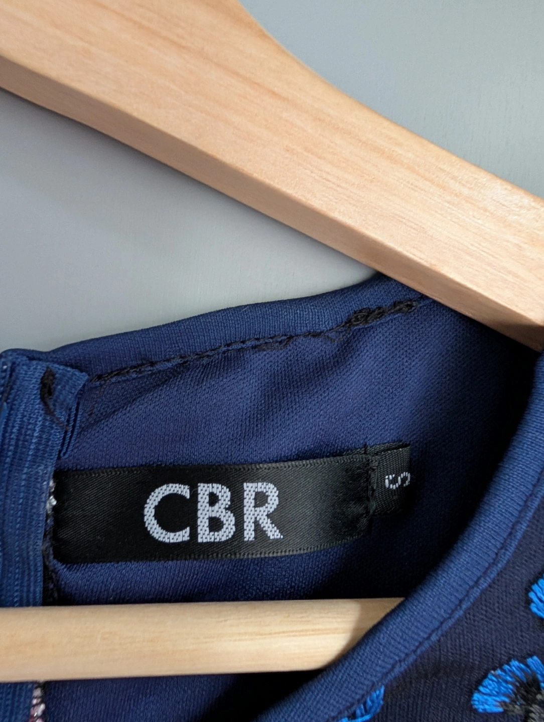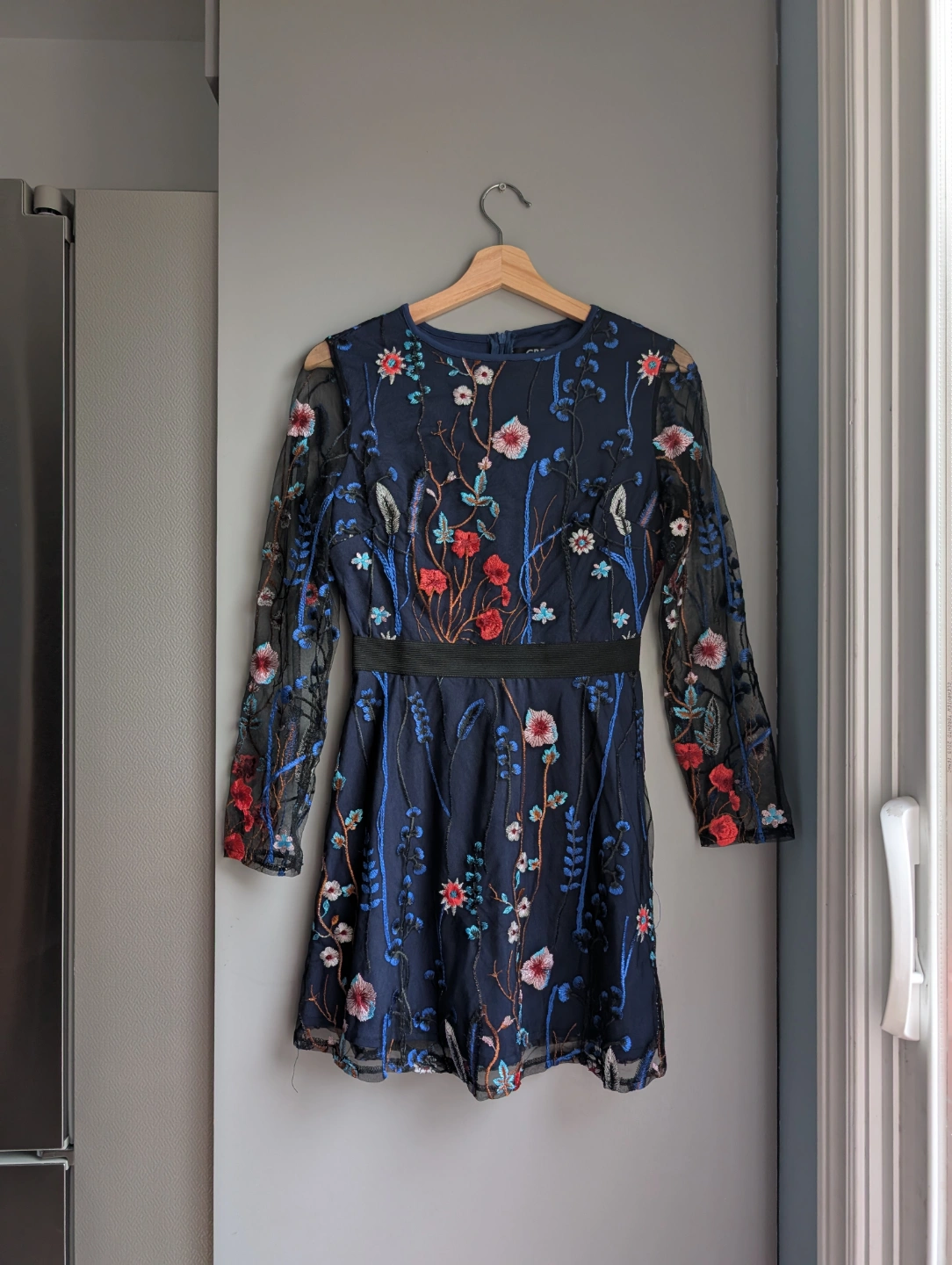 Beautiful navy blue mini dress with long sleeves, colourful floral embroidery. Fits XS/S, has stretch.