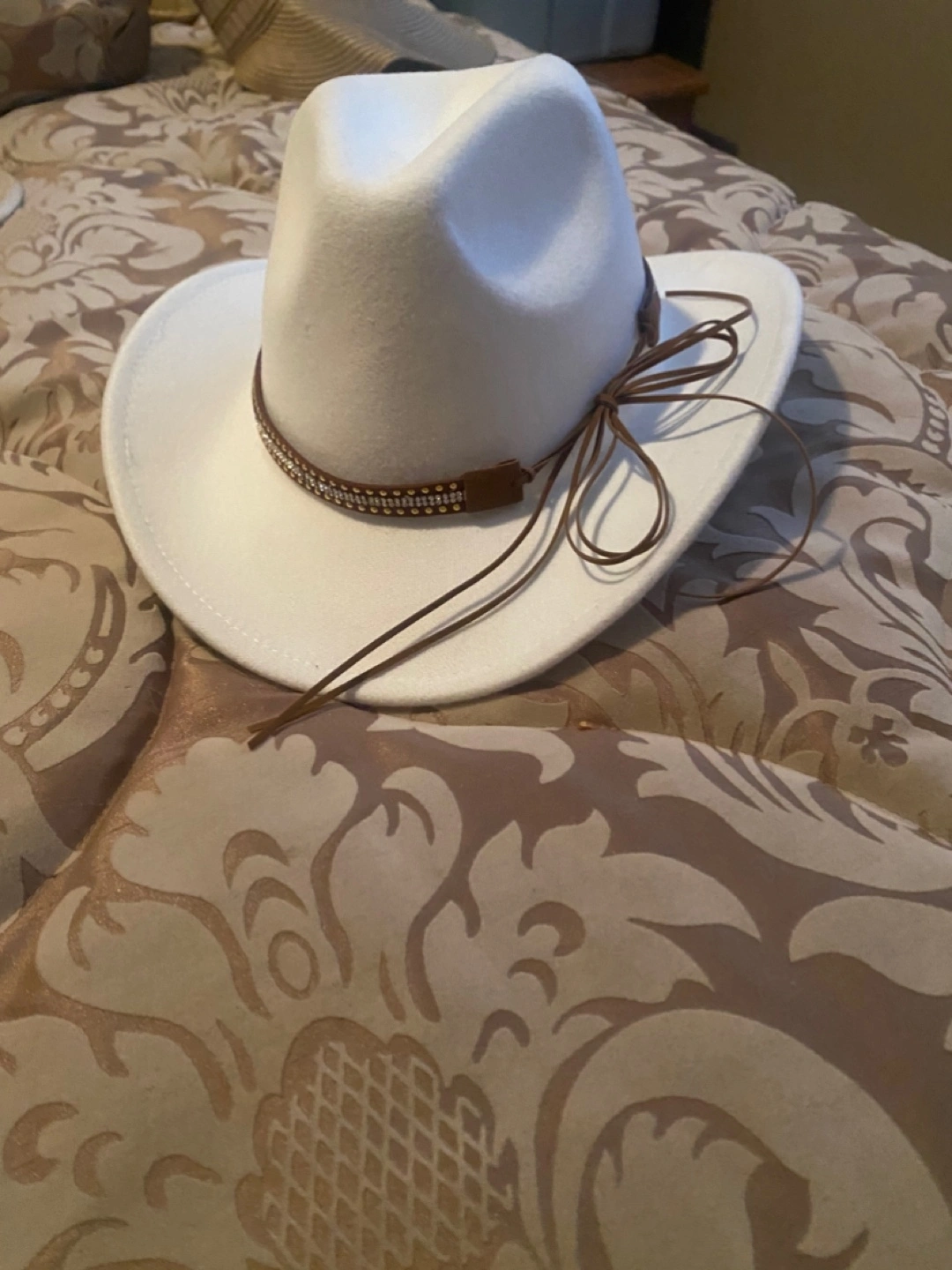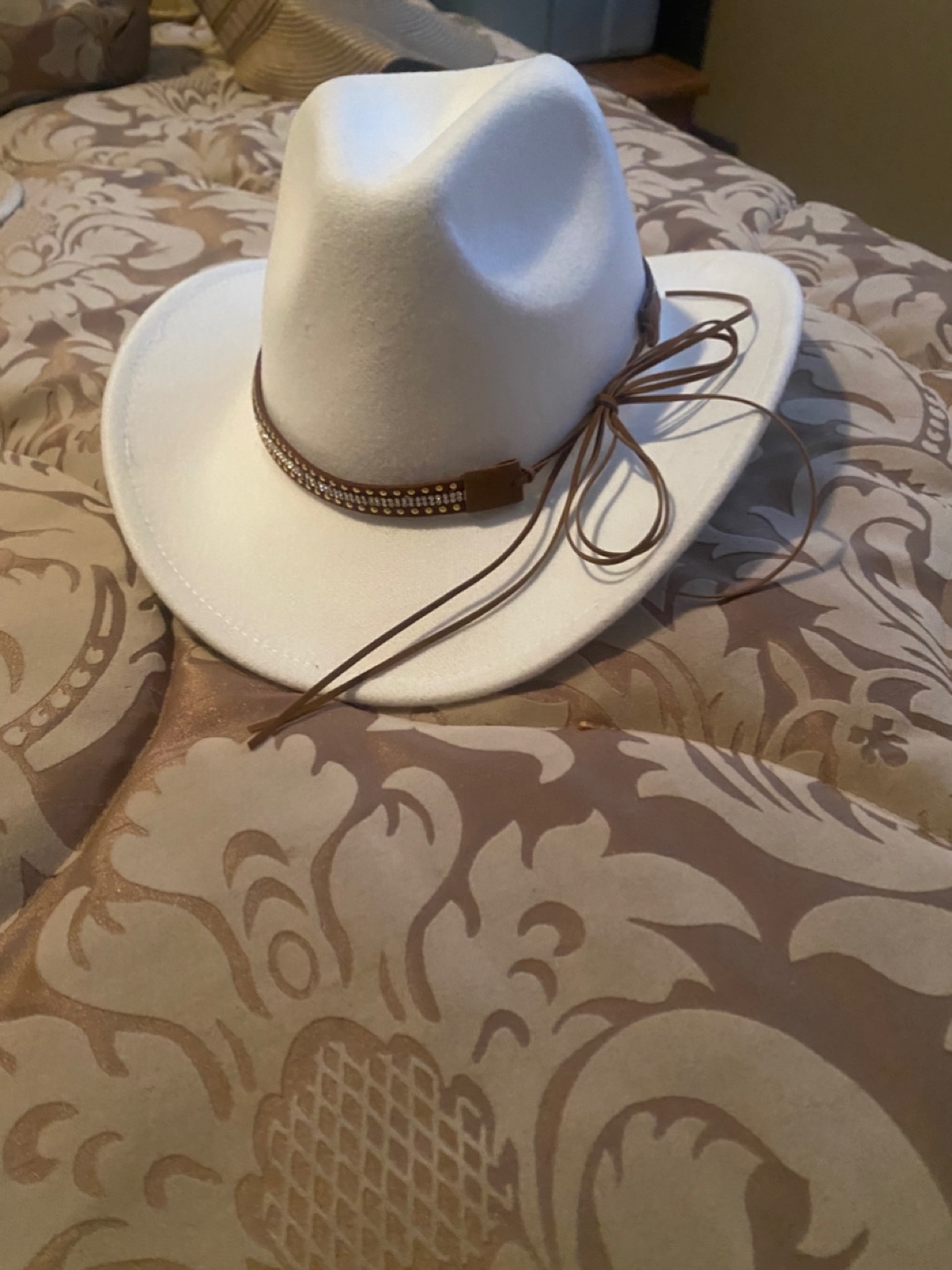 Women's white felt cowboy hat. Features a brown leather band accented with rhinestones. Brown hatband ties in a bow at the back. Perfect for country concerts or festivals.