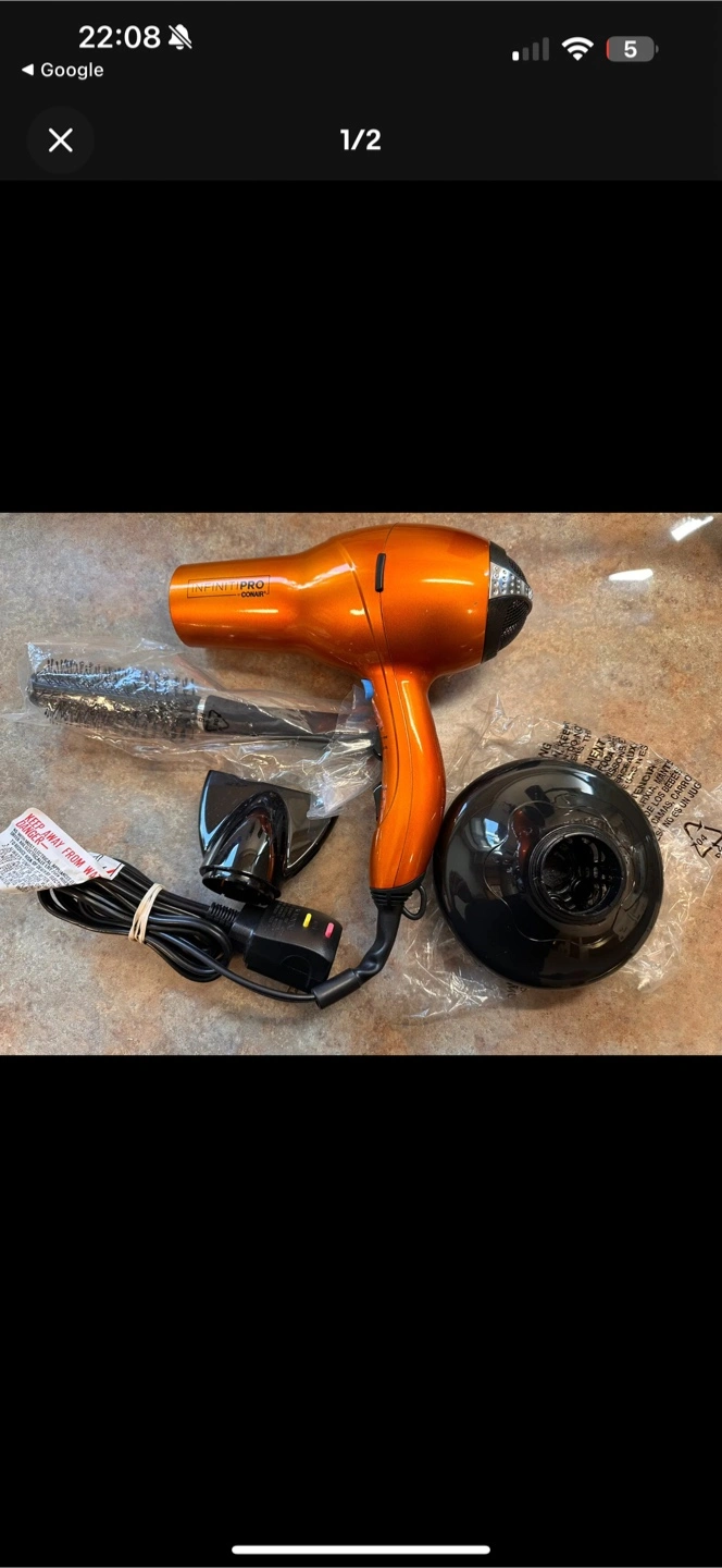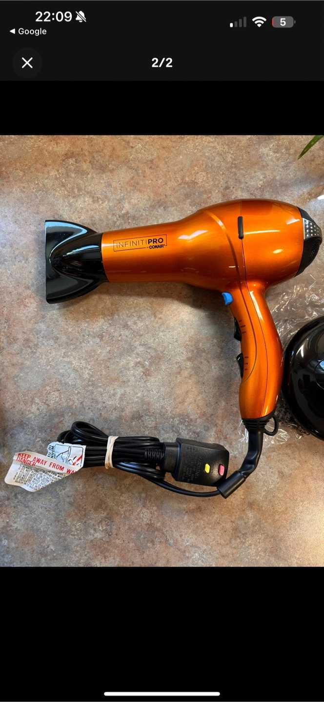 New in box. Copper coloured hair dryer. Features AC motor, ionic technology, and multiple heat/speed settings. Includes concentrator and diffuser attachments