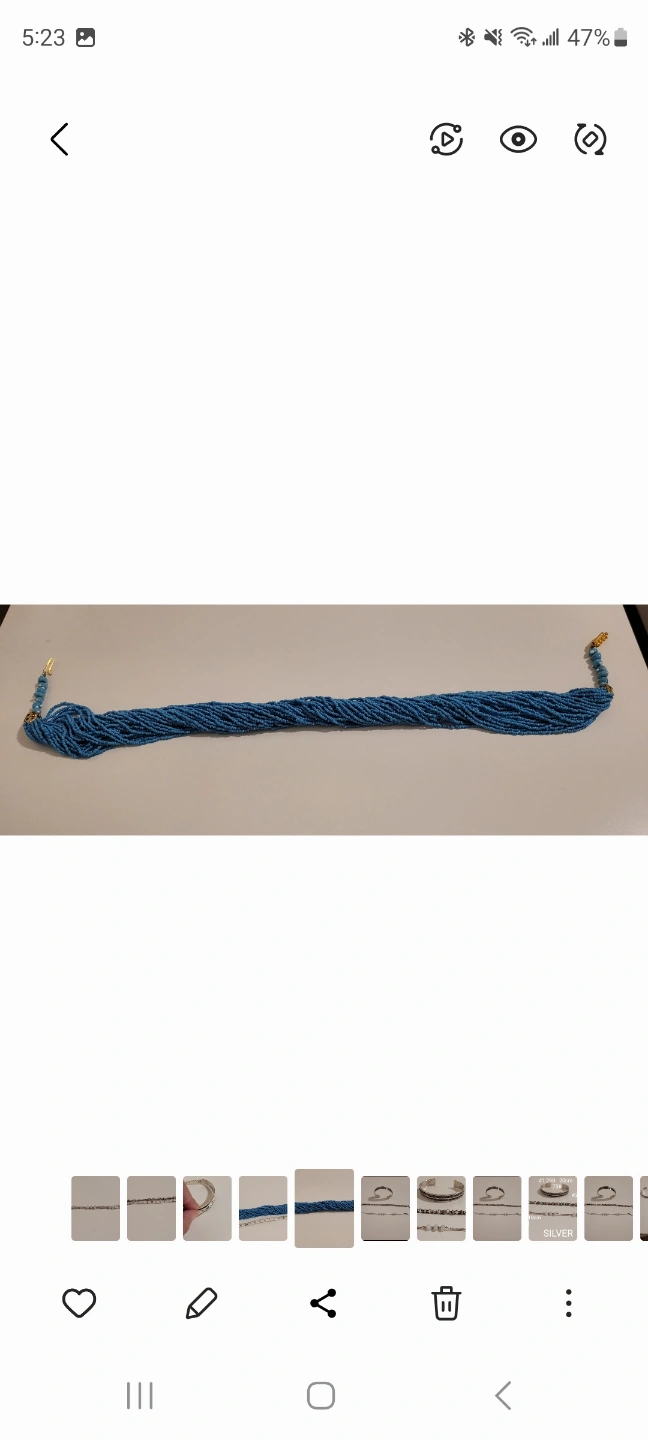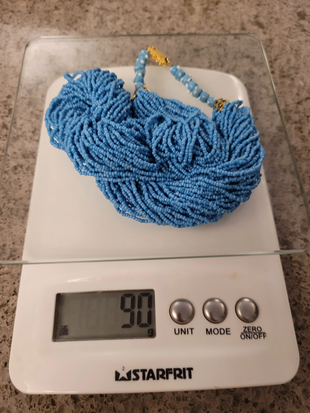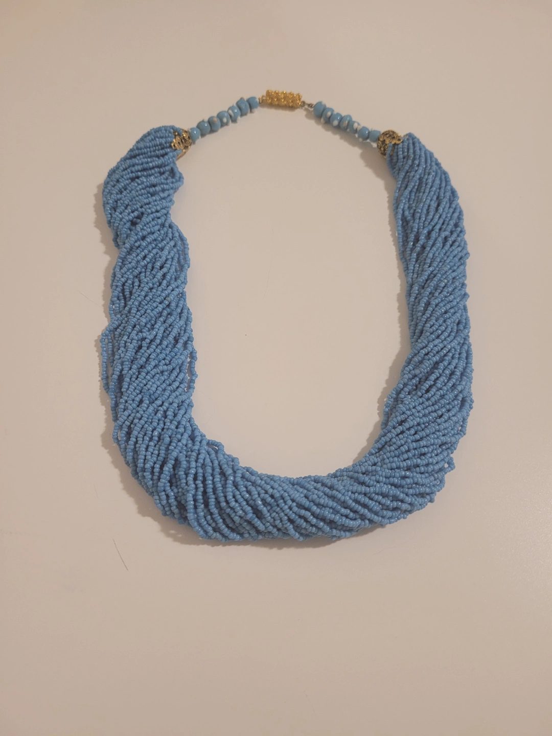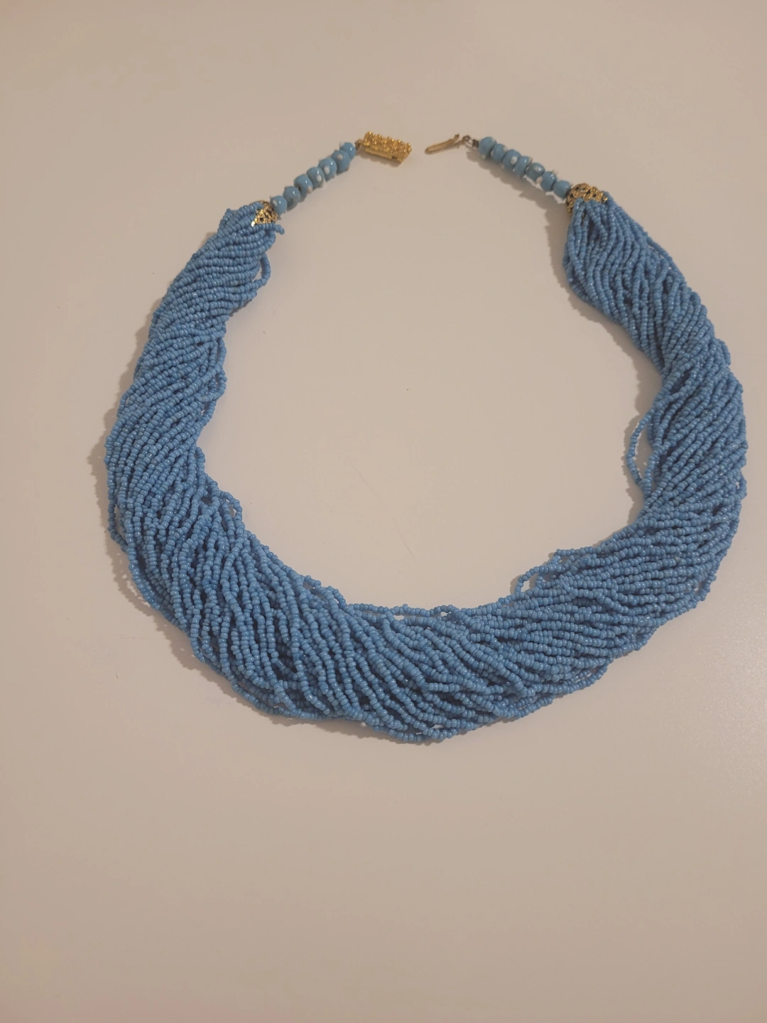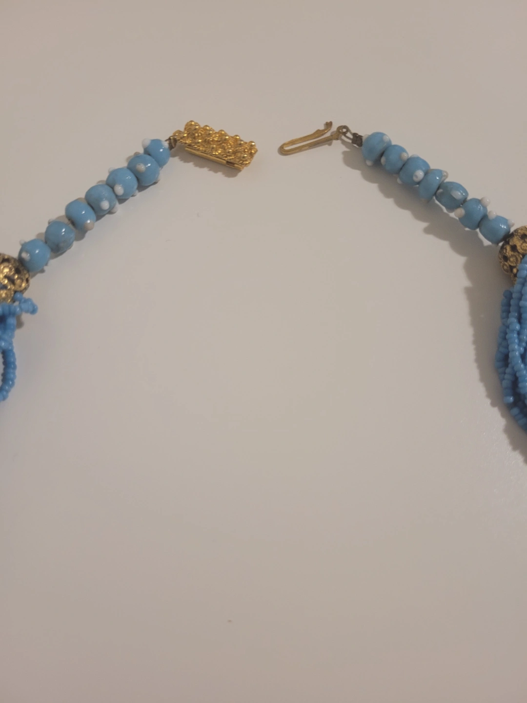 Vintage Gorgeous light blue seed necklace. Features long tassels on either side. Gold plated clasp .Unique statement piece.