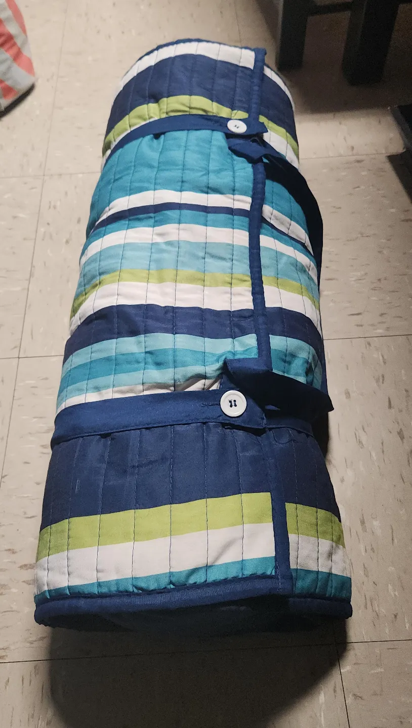 Quilt rolled and tied with fabric straps. Blue, green, and white horizontal stripes. Machine washable just remove the pillow cushion prior to wash.
