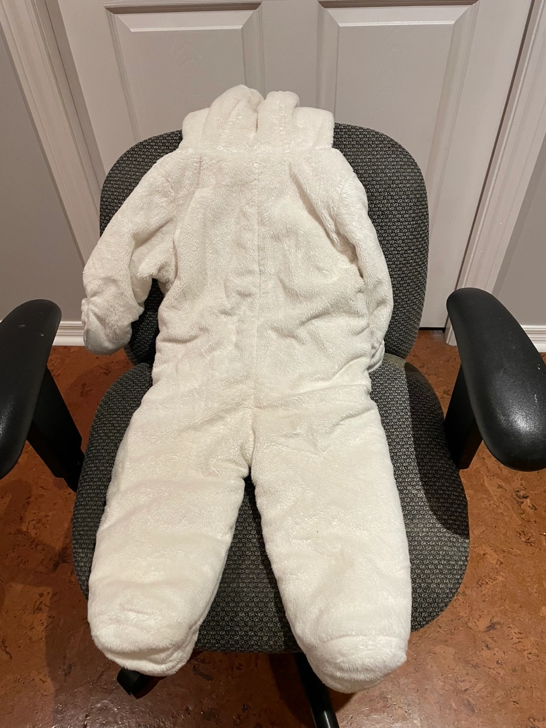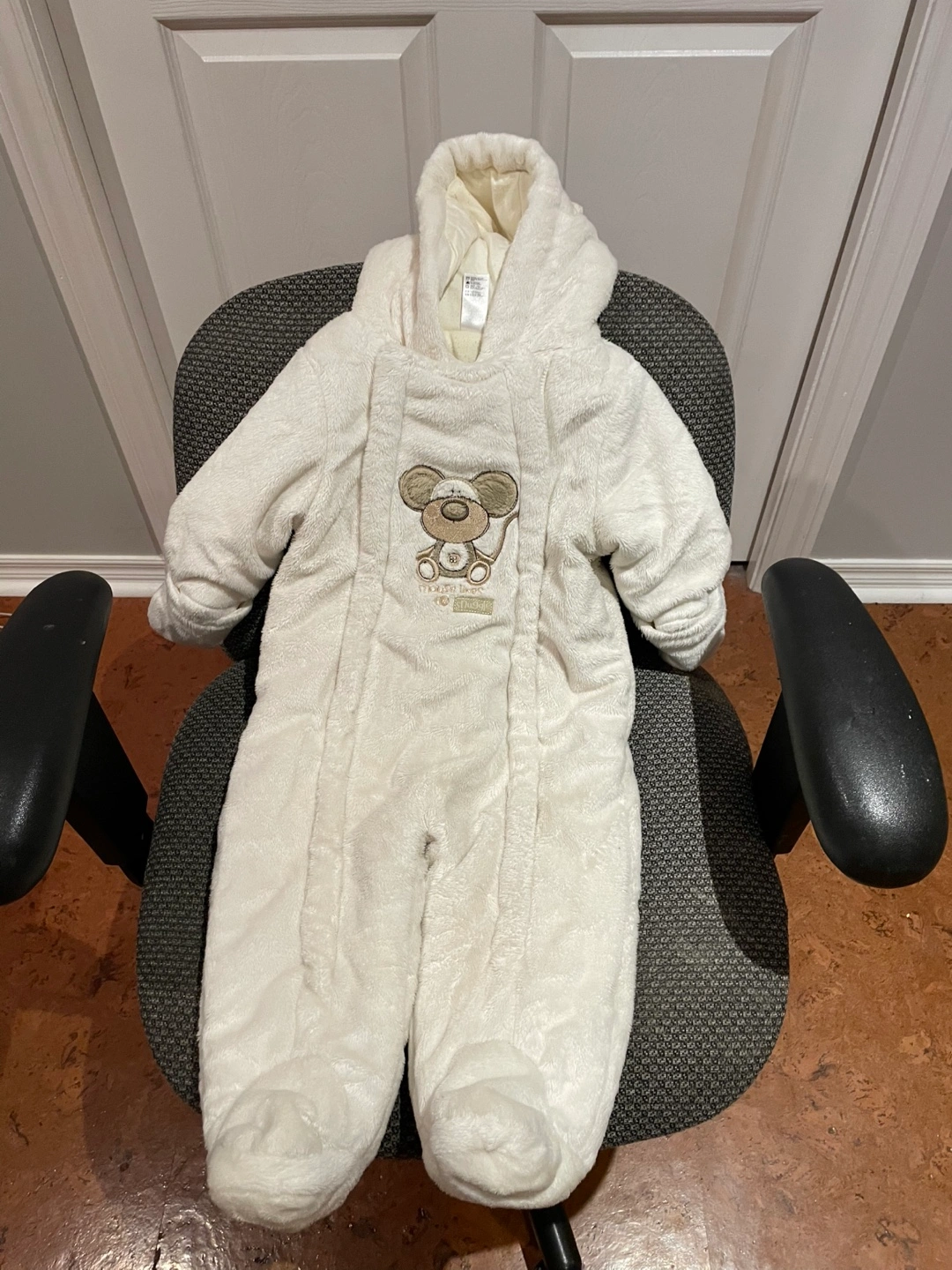 Adorable baby snowsuit, cream coloured fleece. Features a hood and cute embroidered design. Zipper closure. Perfect for keeping your little one warm during the winter months. Size 6 month old