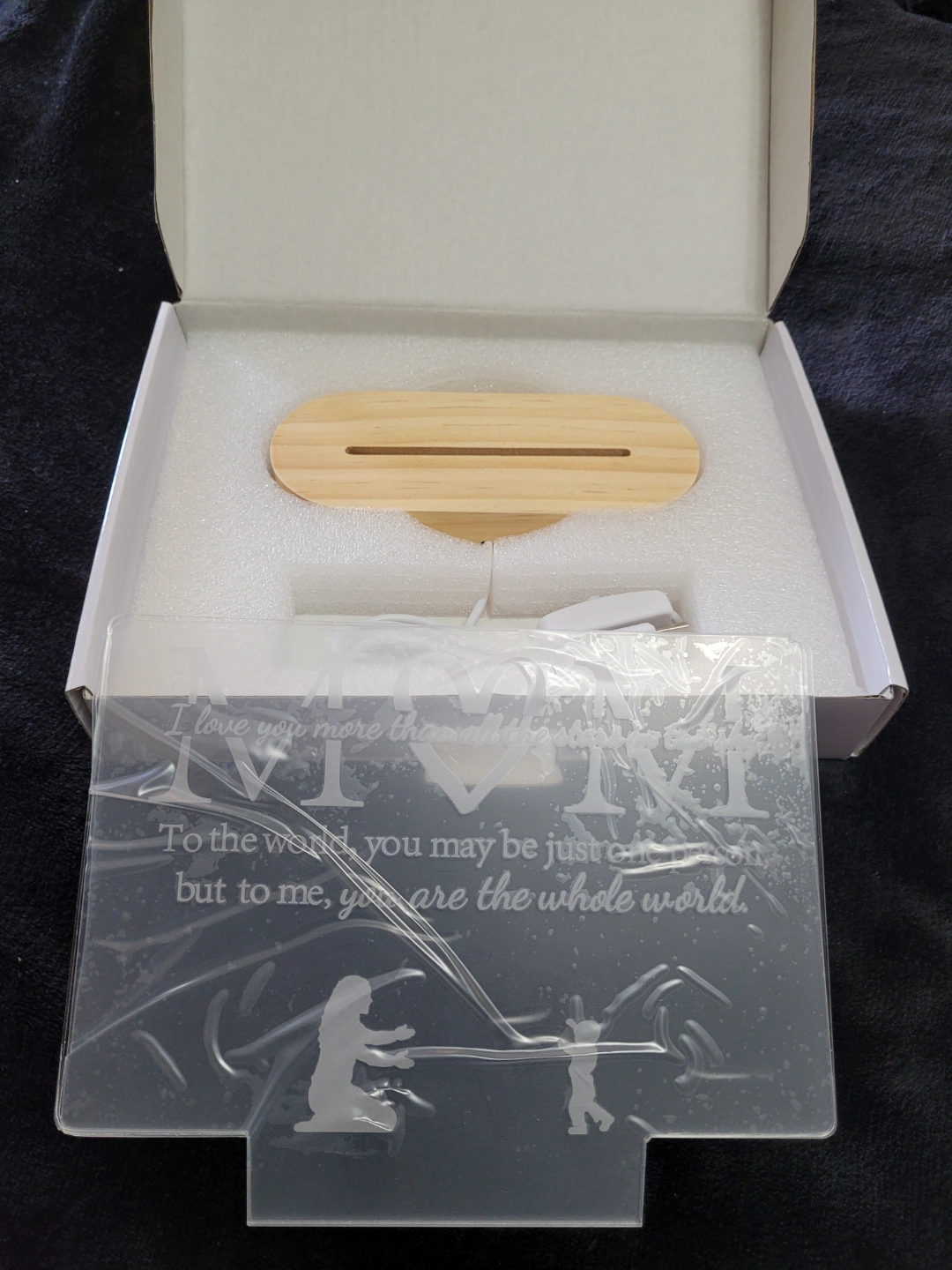 New in box. Cute LED night light. Features an engraved acrylic sign with a heartwarming message for Mom. Includes a small wooden base. Perfect gift for Mother's Day or any occasion.