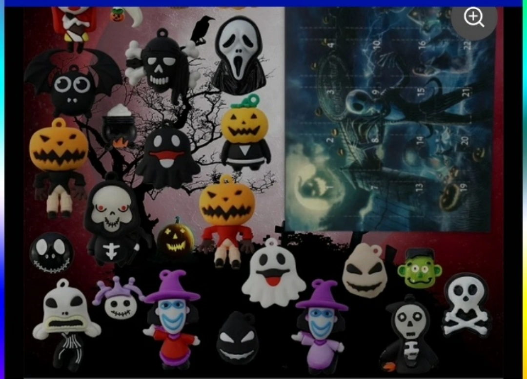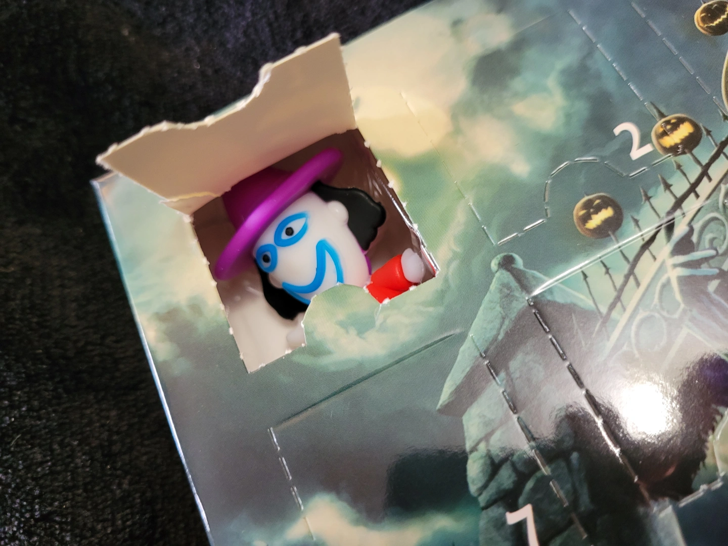 Nightmare Before Christmas advent calendar. Features 24 doors, each concealing a small collectible figurine. Box shows Jack Skellington and Halloween Town imagery. One figurine already opened. Great for fans of Tim Burton and Halloween.
