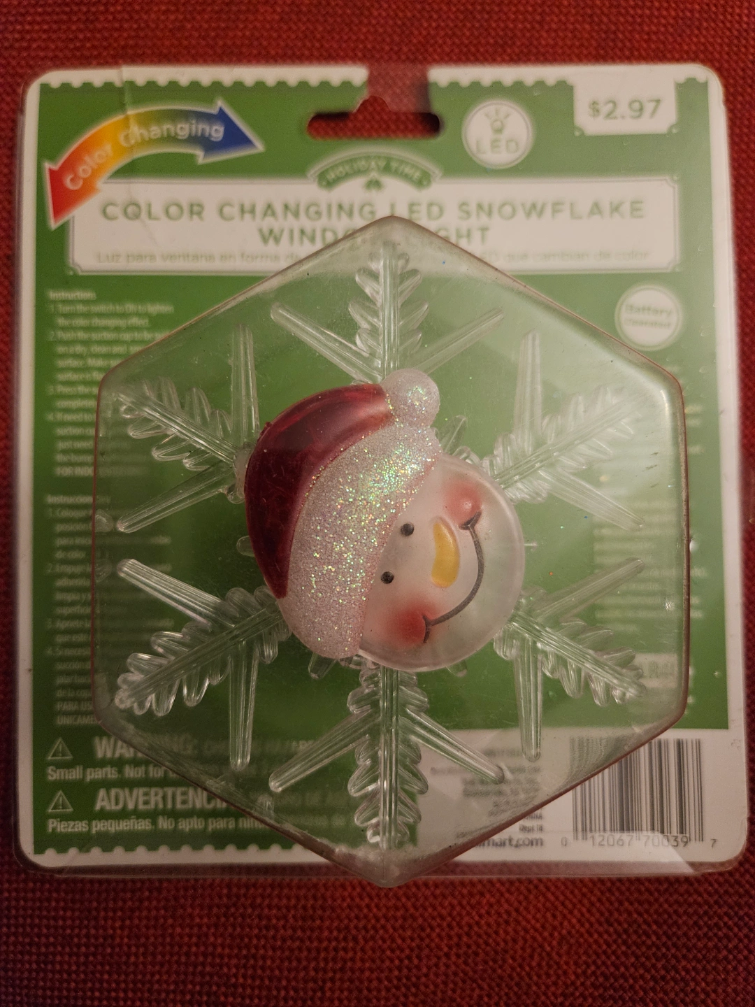 Battery-operated LED snowflake window light. Features a snowman design. Color changing lights. Suction cup for easy attachment. Holiday time brand.