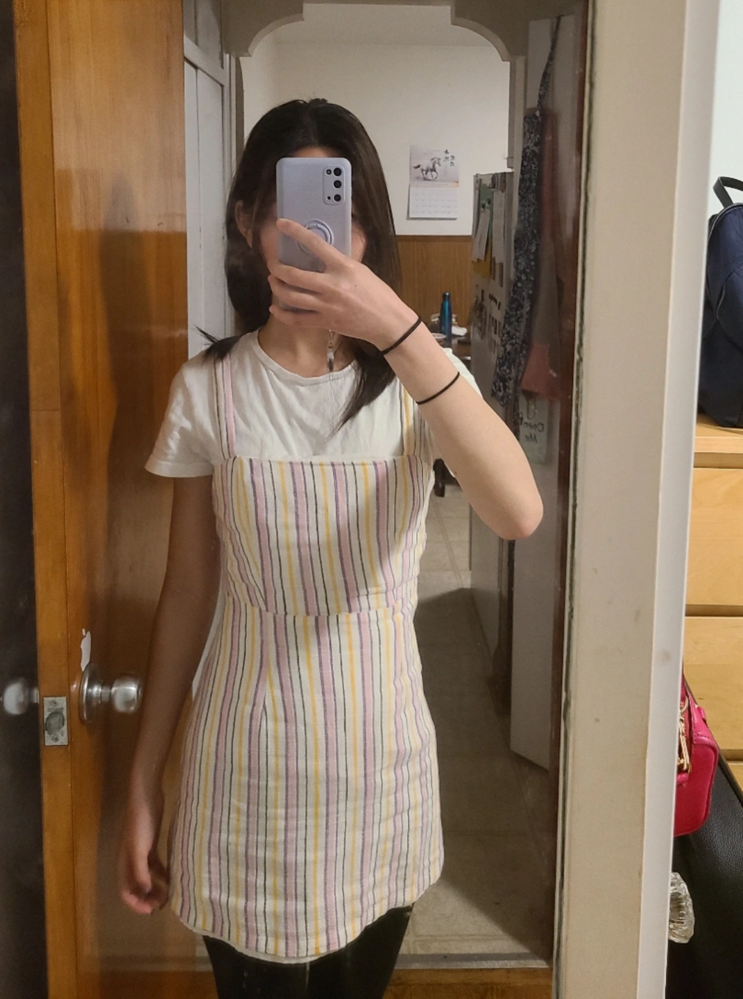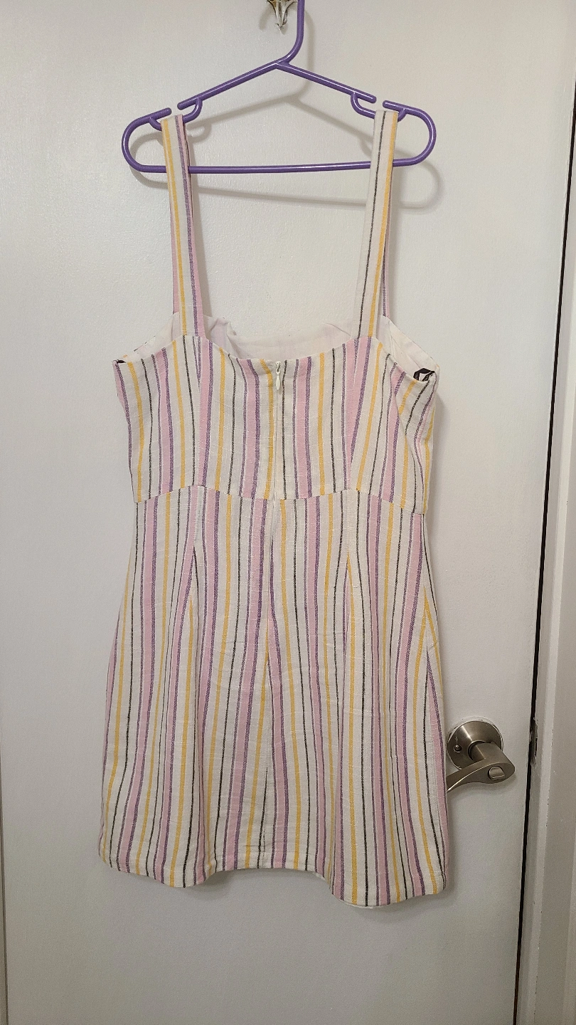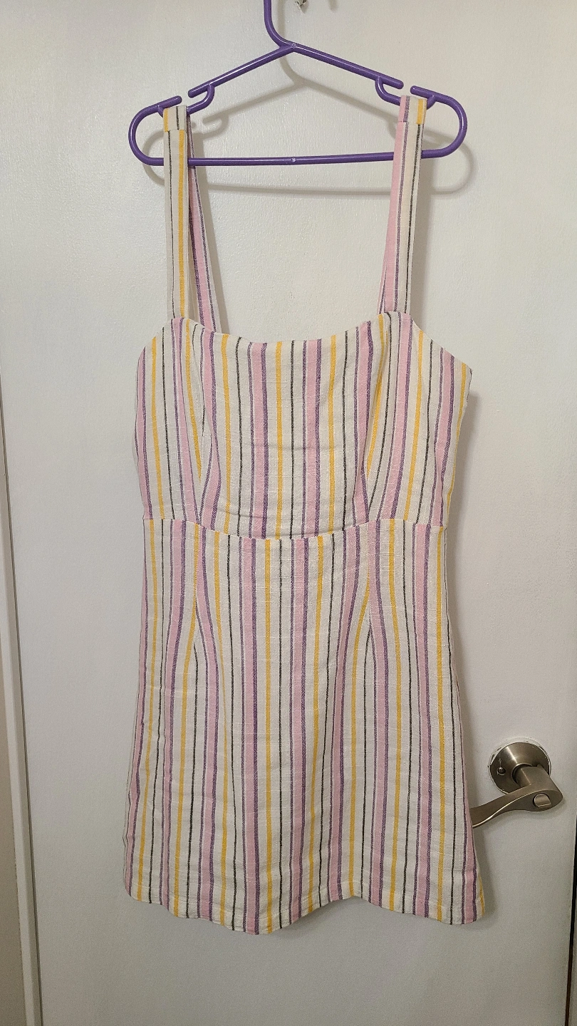 Adorable dress which is too small for me. Features thin straps, a square neckline, and vertical stripes. For reference I am 5'4. feel free to see if it fits before buying