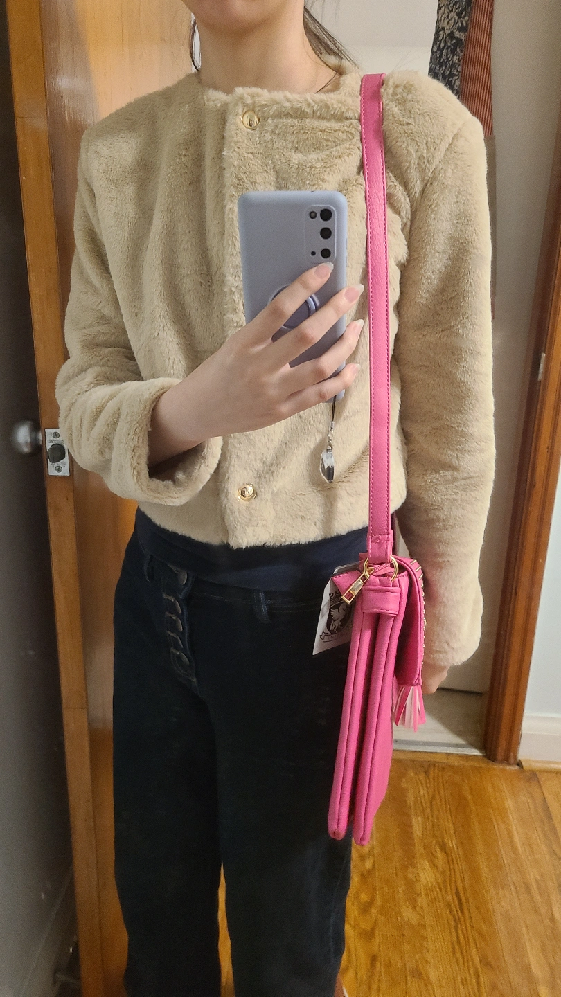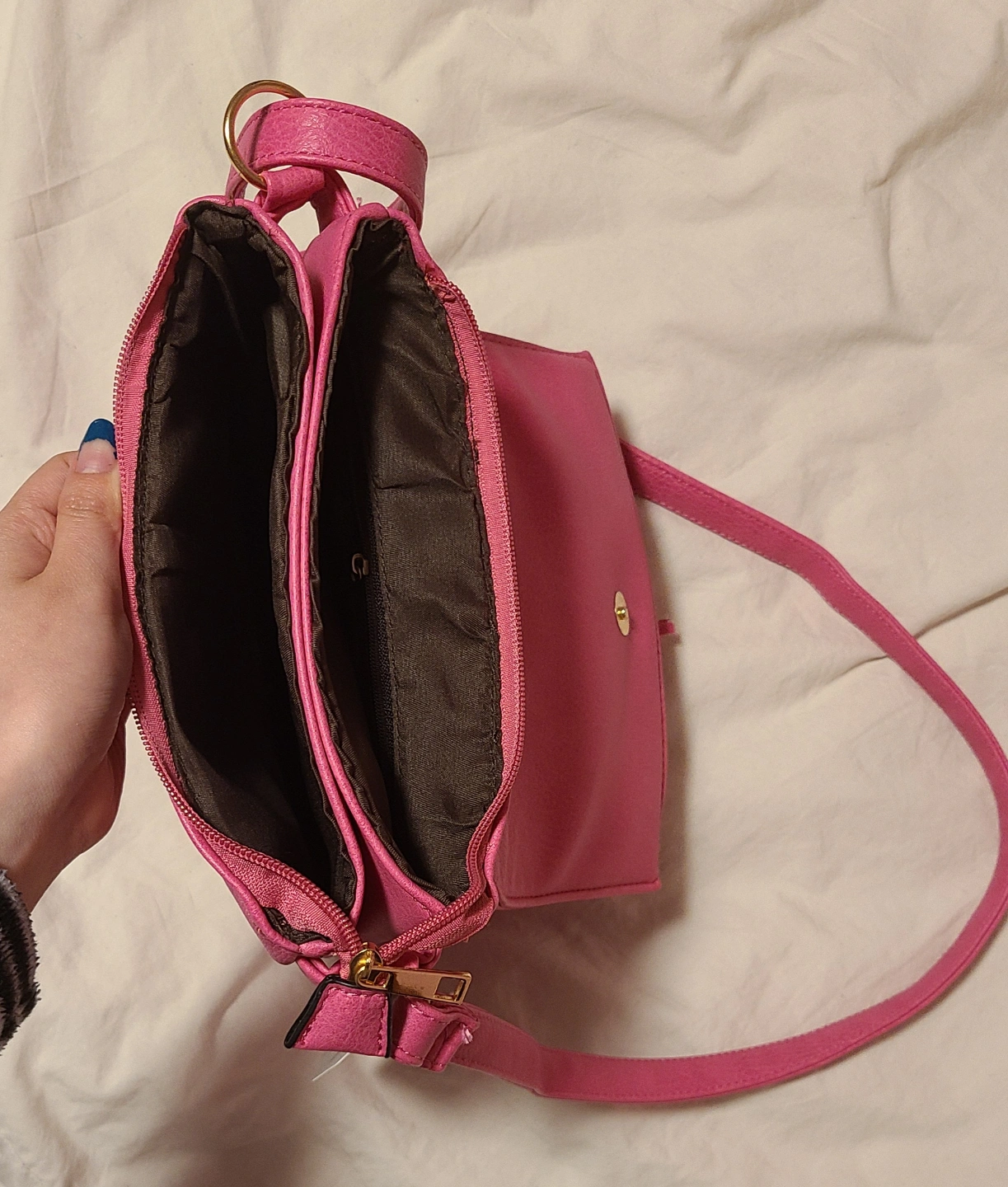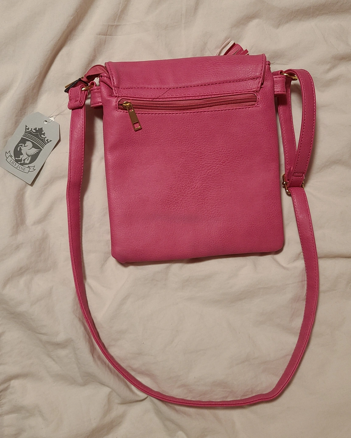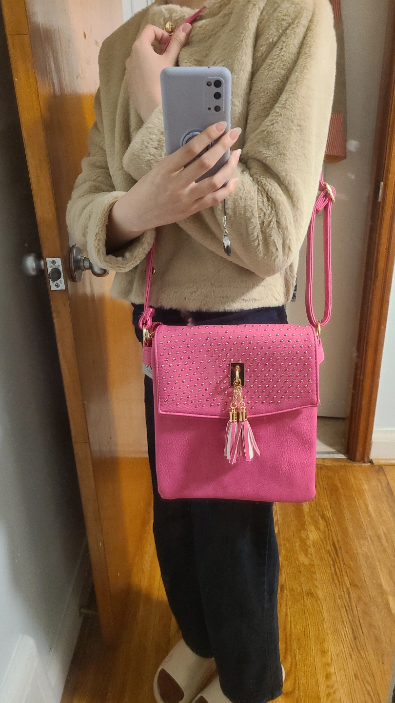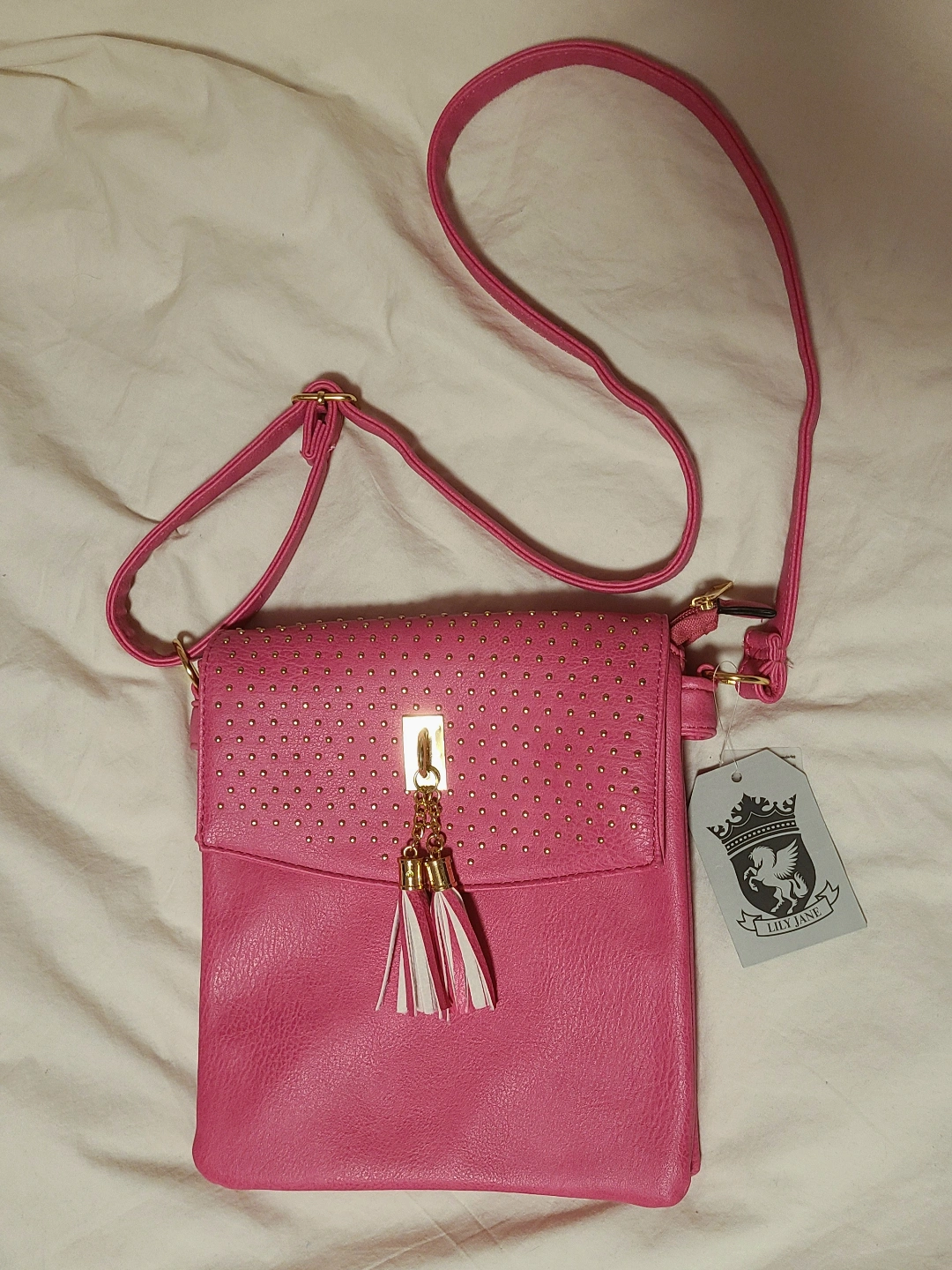 Hot pink crossbody bag. Features gold-toned hardware, a tassel accent, and studded detailing. Two compartments. Adjustable strap. Never been worn and brand new with tag.