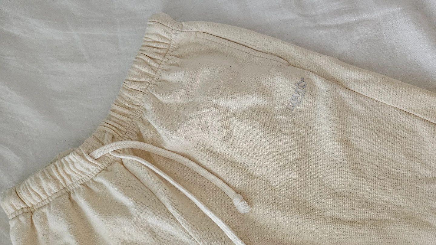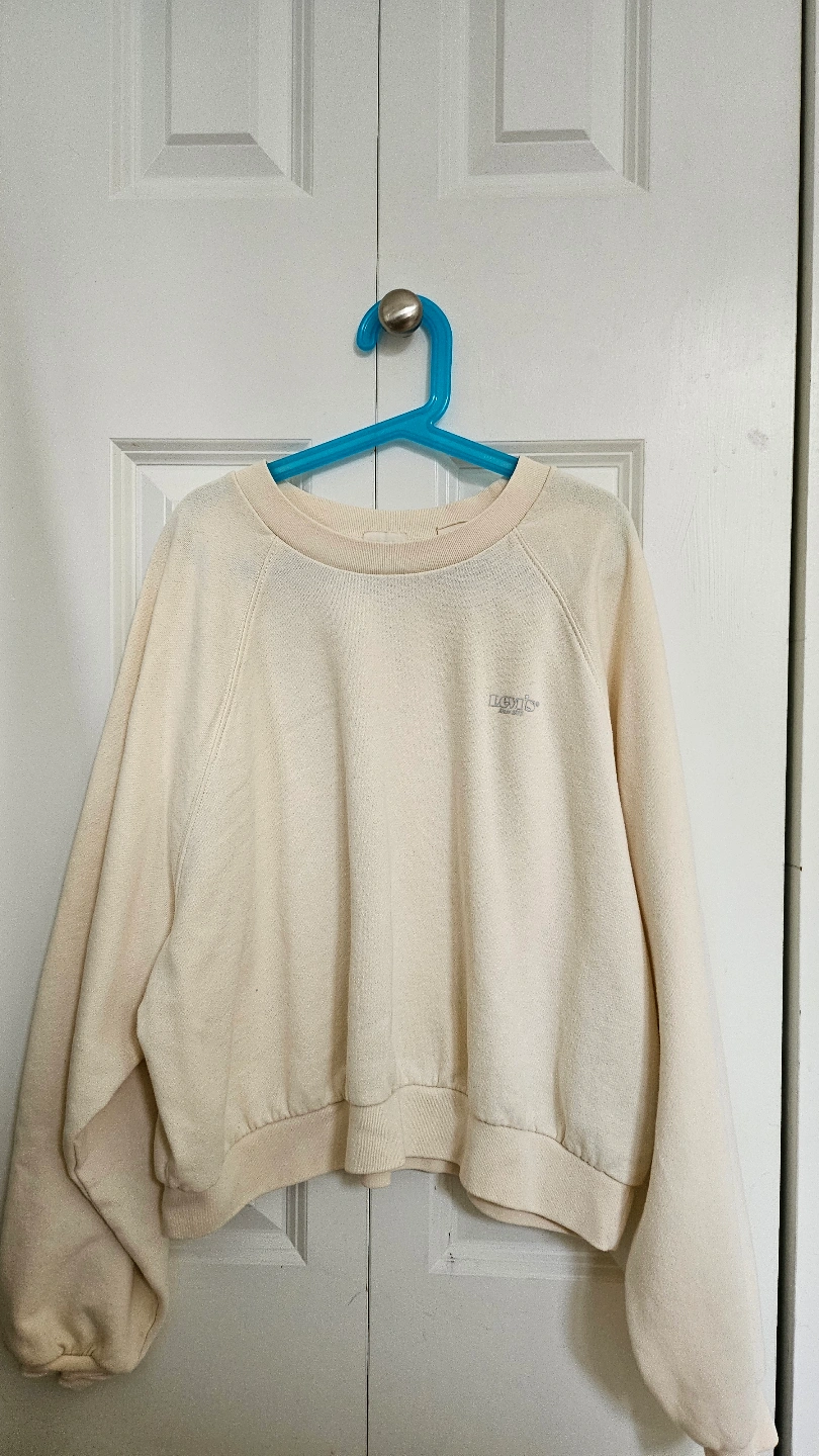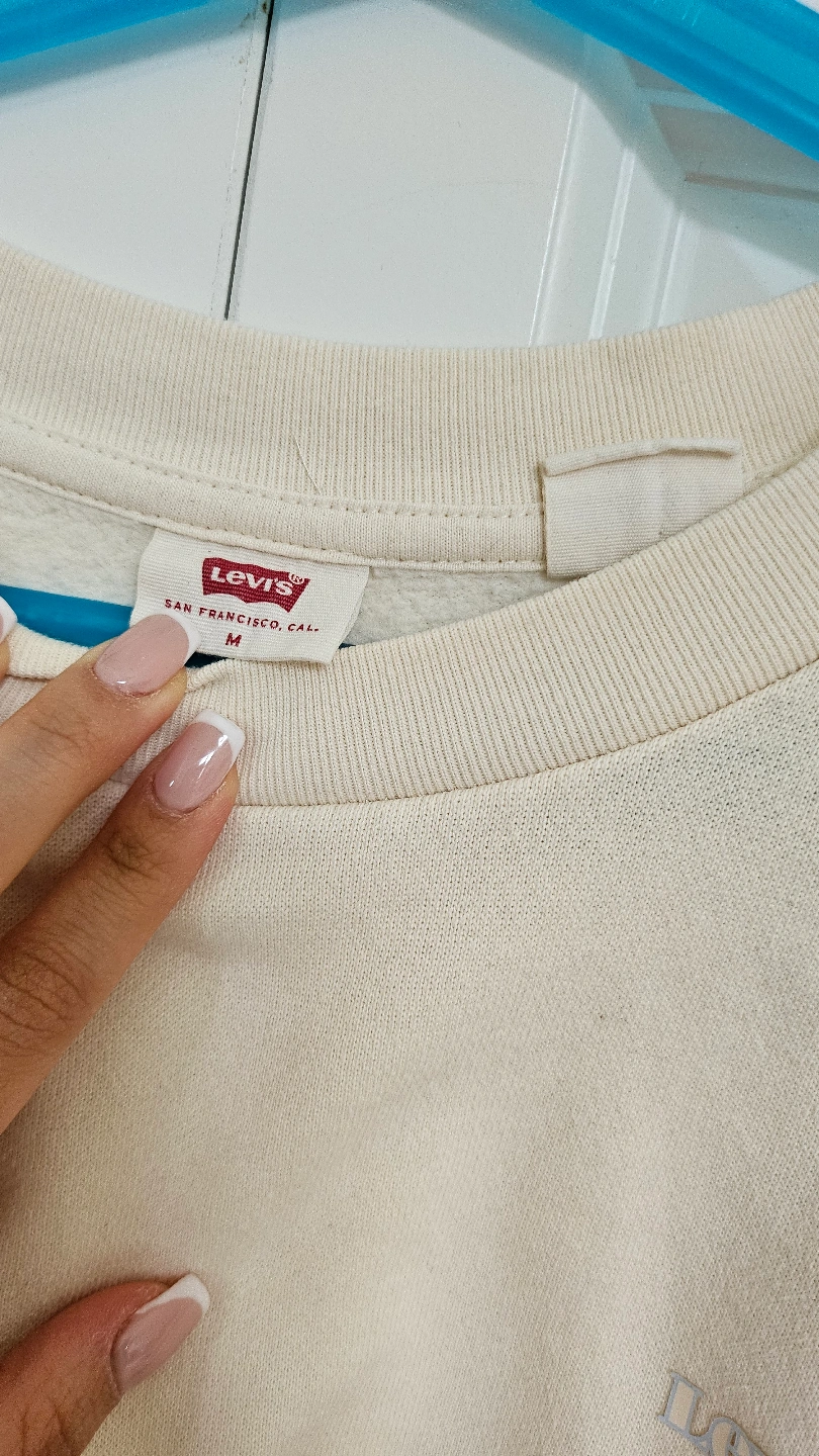 32Cream coloured Levi's cropped sweatshirt and jogger set. Size Medium. Soft material. Perfect for lounging. Small bleach stains on back of one sweat pant which is why price is cheaper.