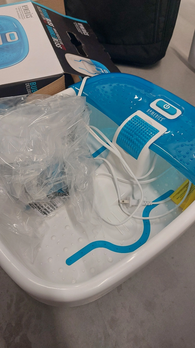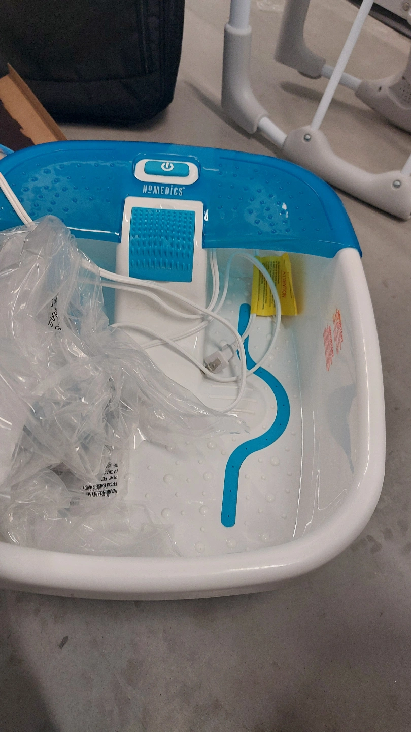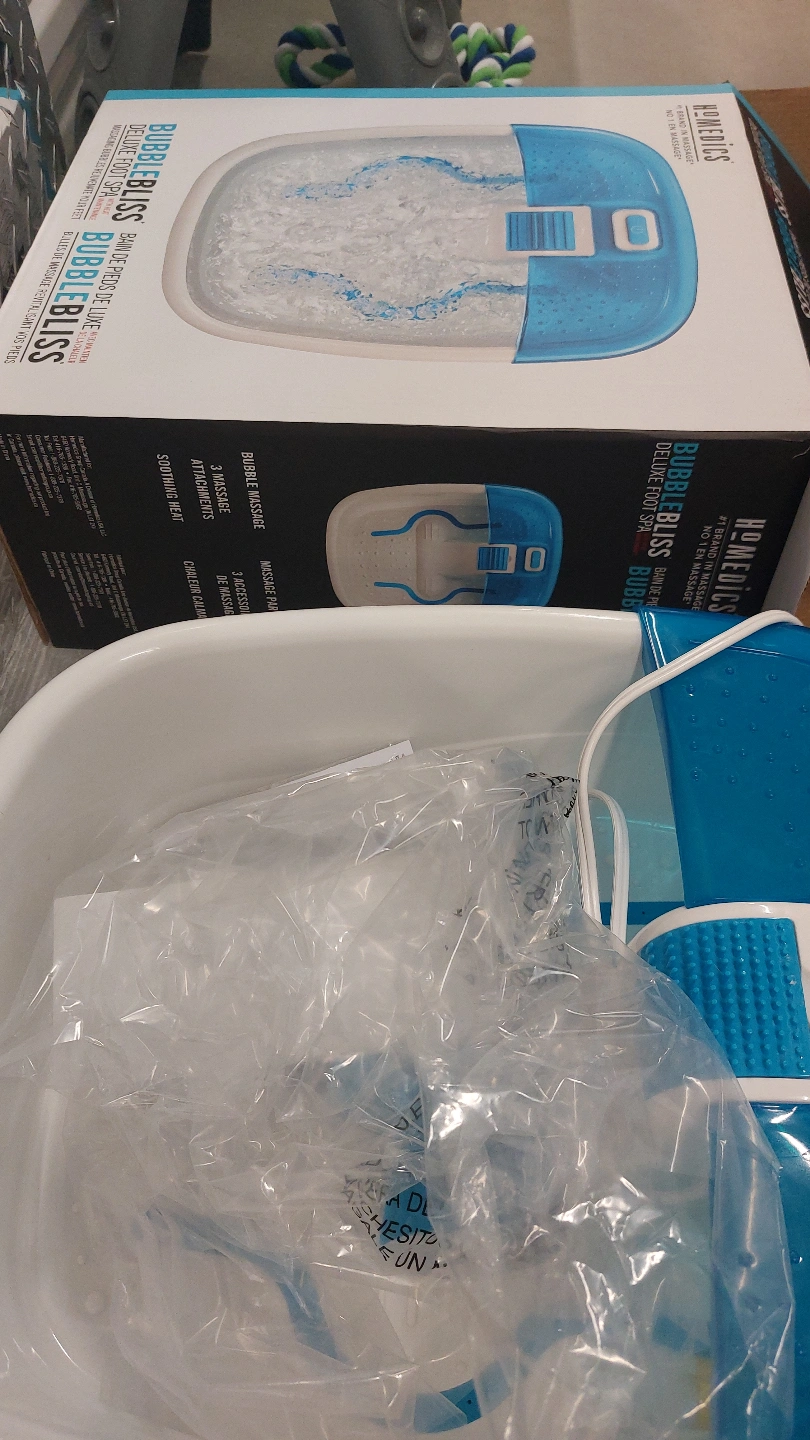 Features massaging bubbles. Rejuvenates your feet. Includes power cord and instructions. Blue and white colour.
