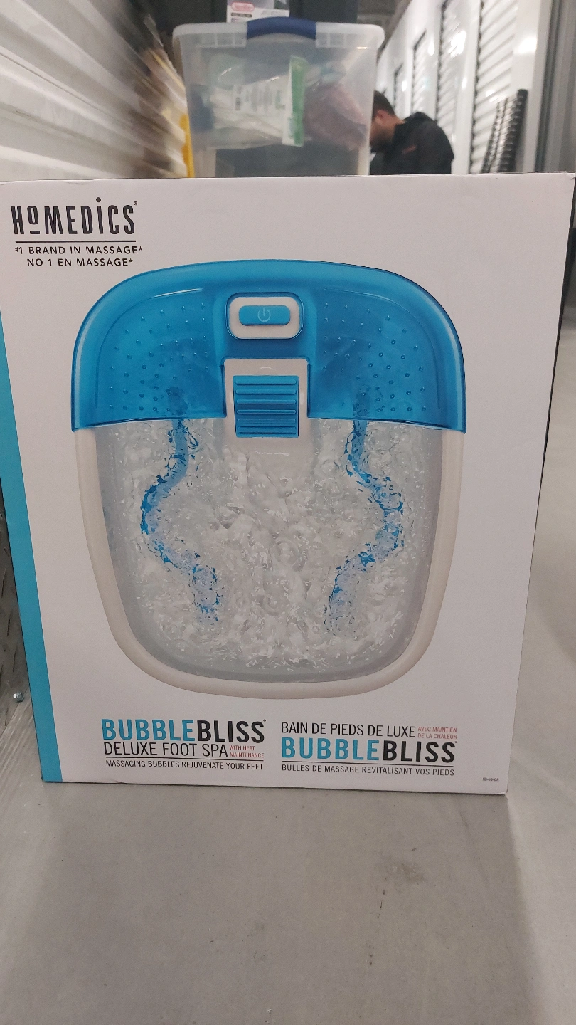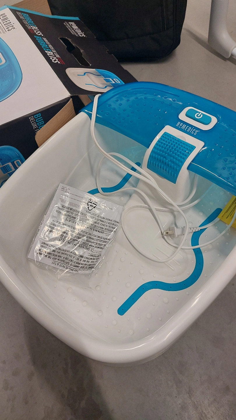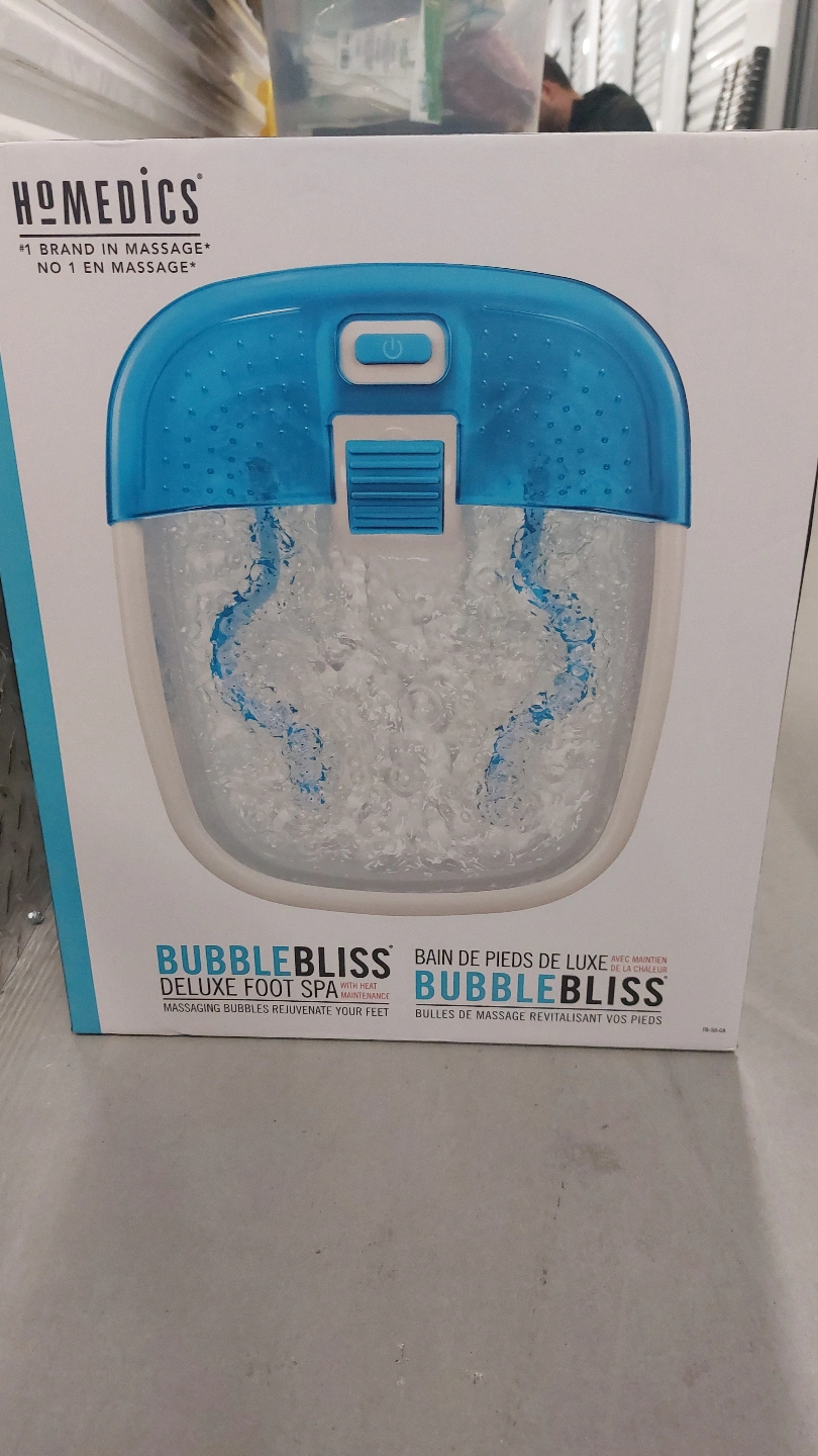 Features massaging bubbles. Rejuvenates your feet. Includes power cord and instructions. Blue and white colour.