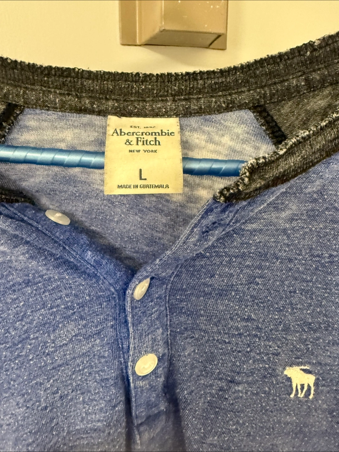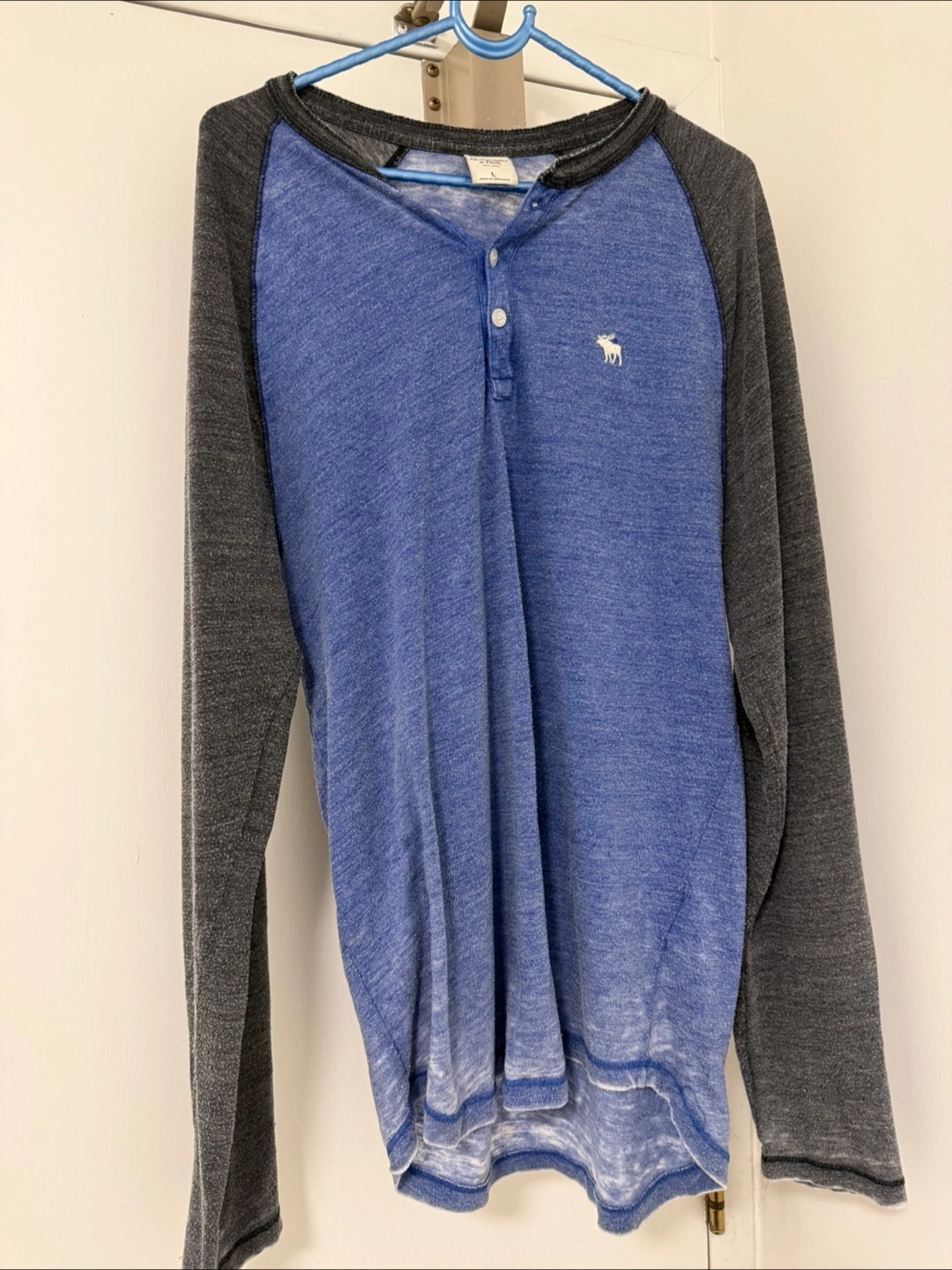 Men's long-sleeve henley shirt. Blue and grey colour block. Size large. Made in Guatemala.My son does not wear this anymore,I am decluttering his wardrobe as he will be going to Uni,